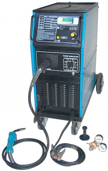 Korpus z ocelového plechu (povrchová úprava práškováním), ochrana proti tepelnému přetížení, chladící ventilátor, centrální přípojka, 2 kladky podávání drátu, 2 vodící / 2 pojezdová kola, transportní madla
