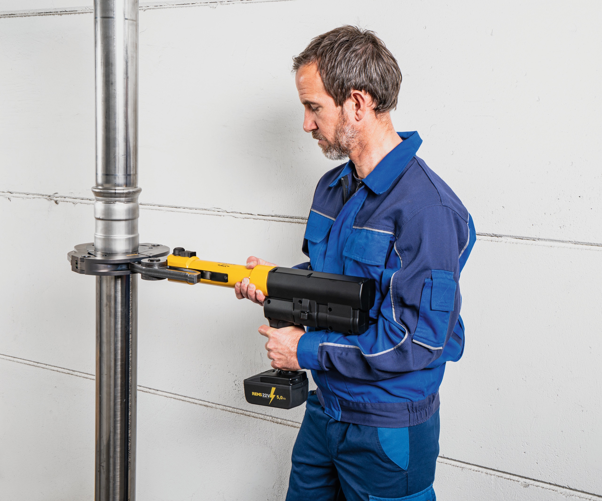 Výkonný akumulátorový radiální lis určený pro profesionální lisování velkých průměrů potrubí