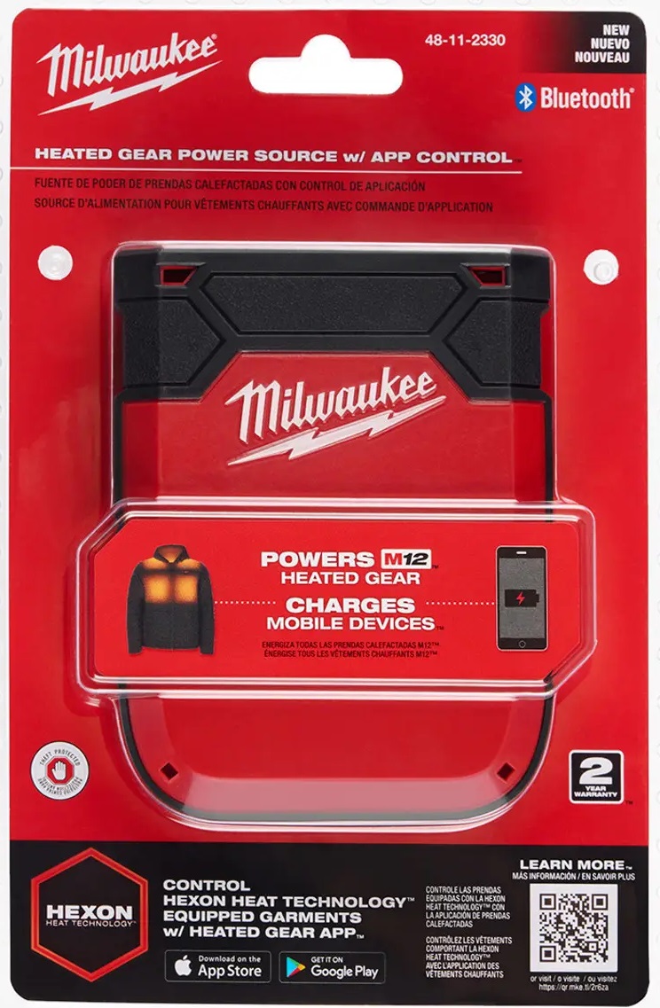 Umožňuje současně napájet vyhřívaný oděv a nabíjet zařízení, nabízí obousměrné USB-C nabíjení a podporuje chytré Bluetooth ovládání přes aplikaci Milwaukee Heated Gear.