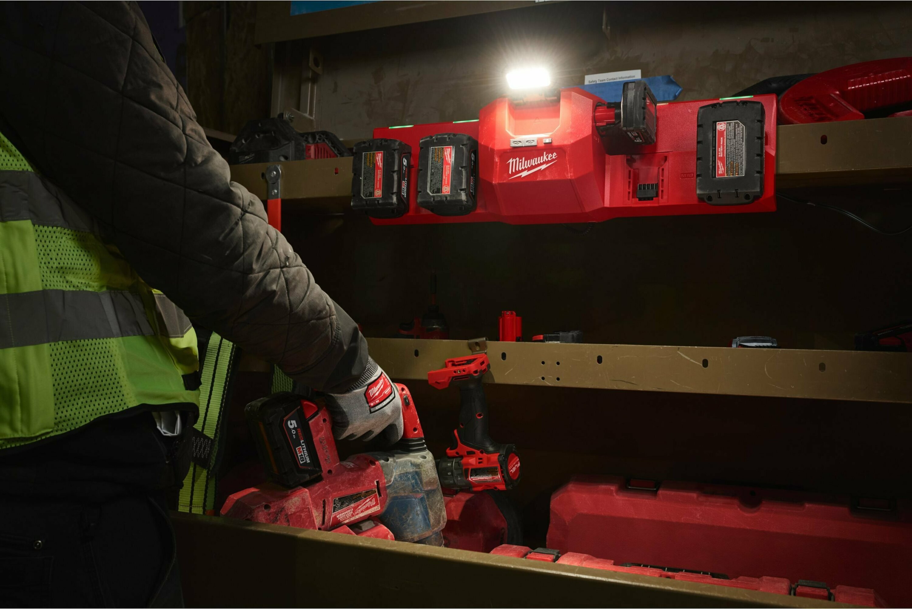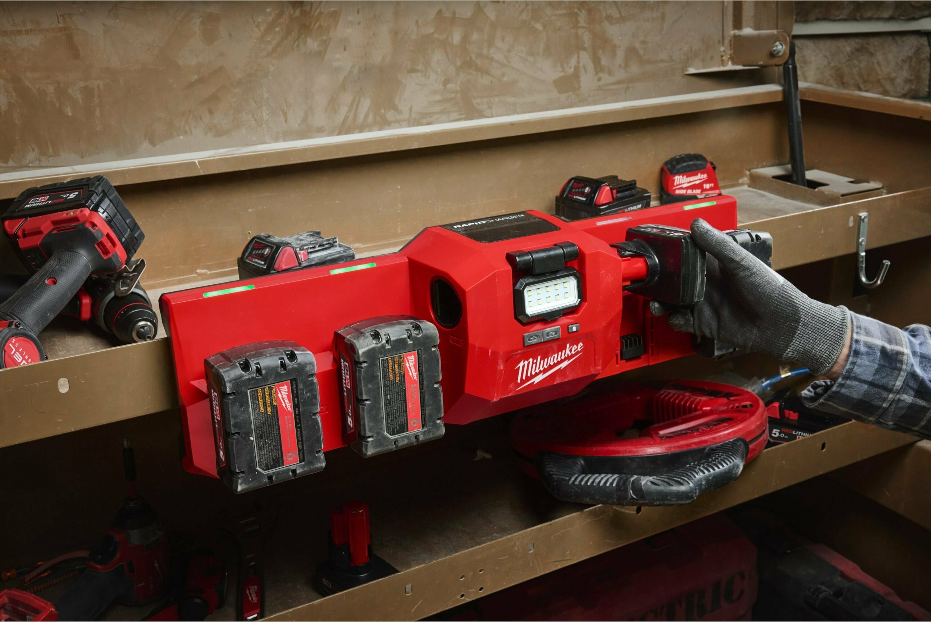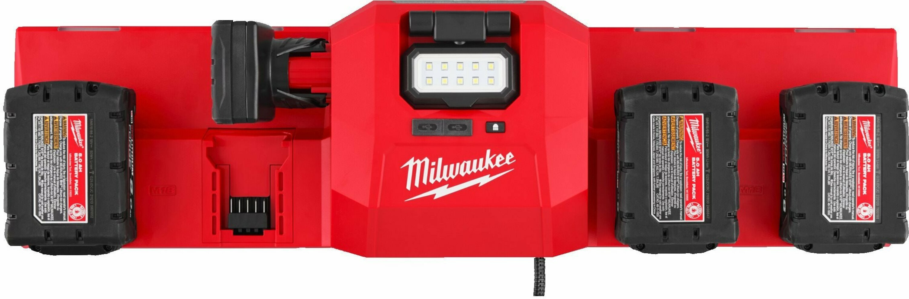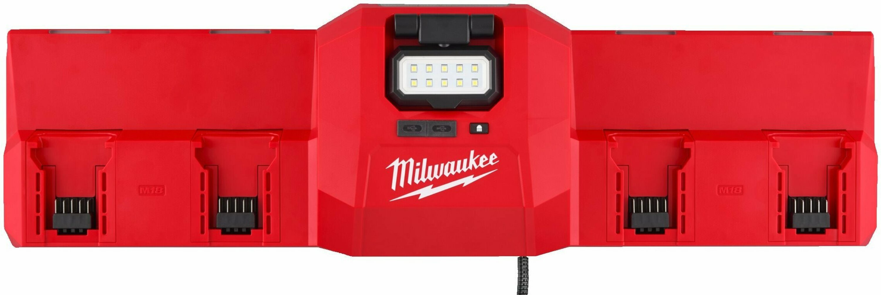 Magnetická nabíjecí stanice Milwaukee M12-18 GBC4 kombinuje rychlonabíječku a výkonné pracovní LED osvětlení v jednom kompaktním zařízení. Umožňuje současné nabíjení čtyř akumulátorů M12™ a M18™ a je ideální pro montáž do ocelových skříněk, kontejnerů či úložných prostorů na staveništi.