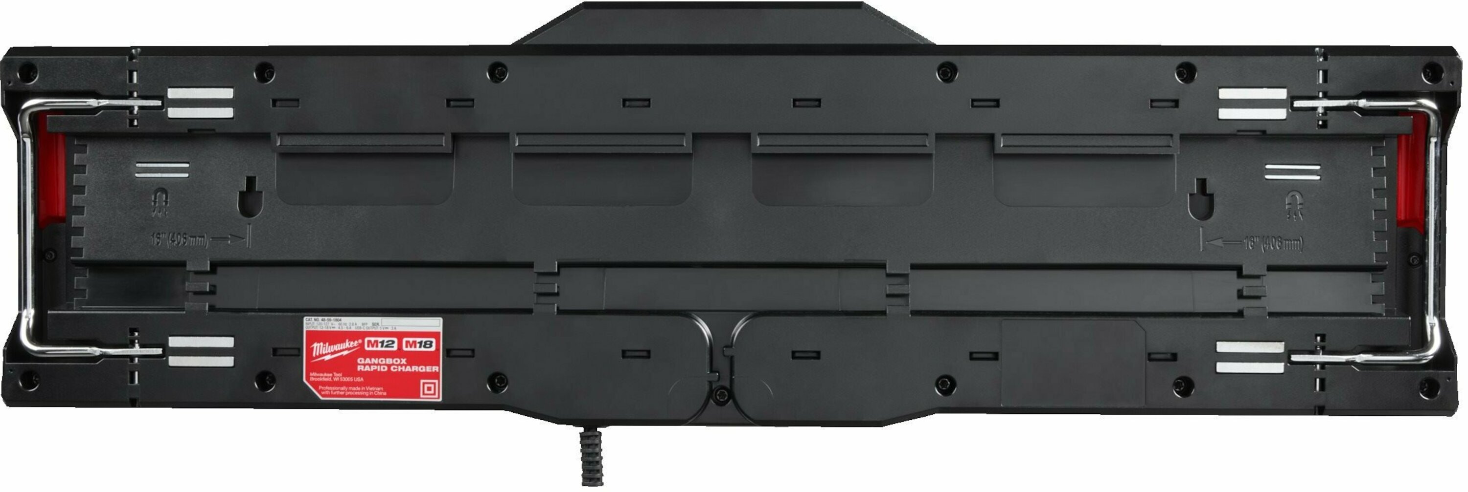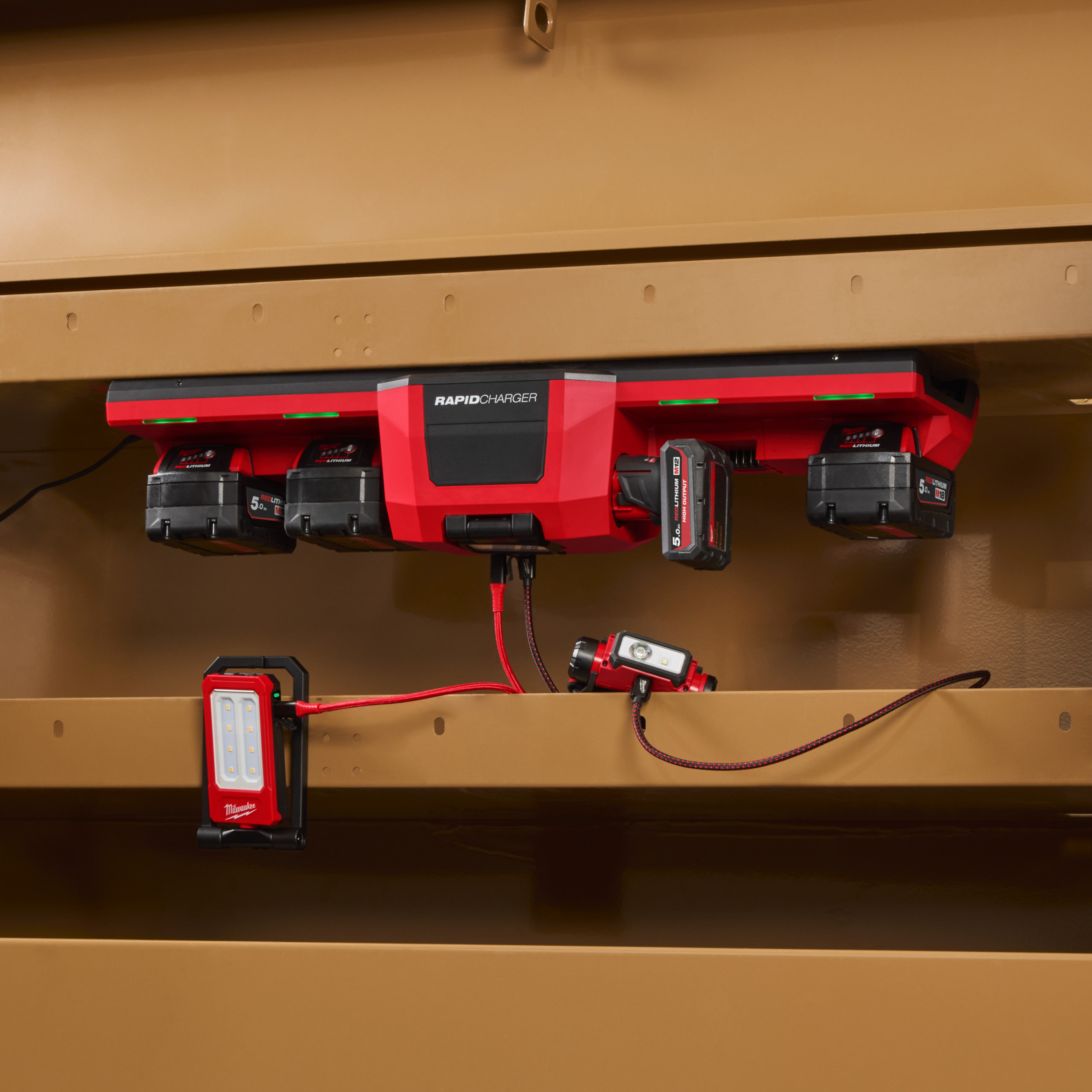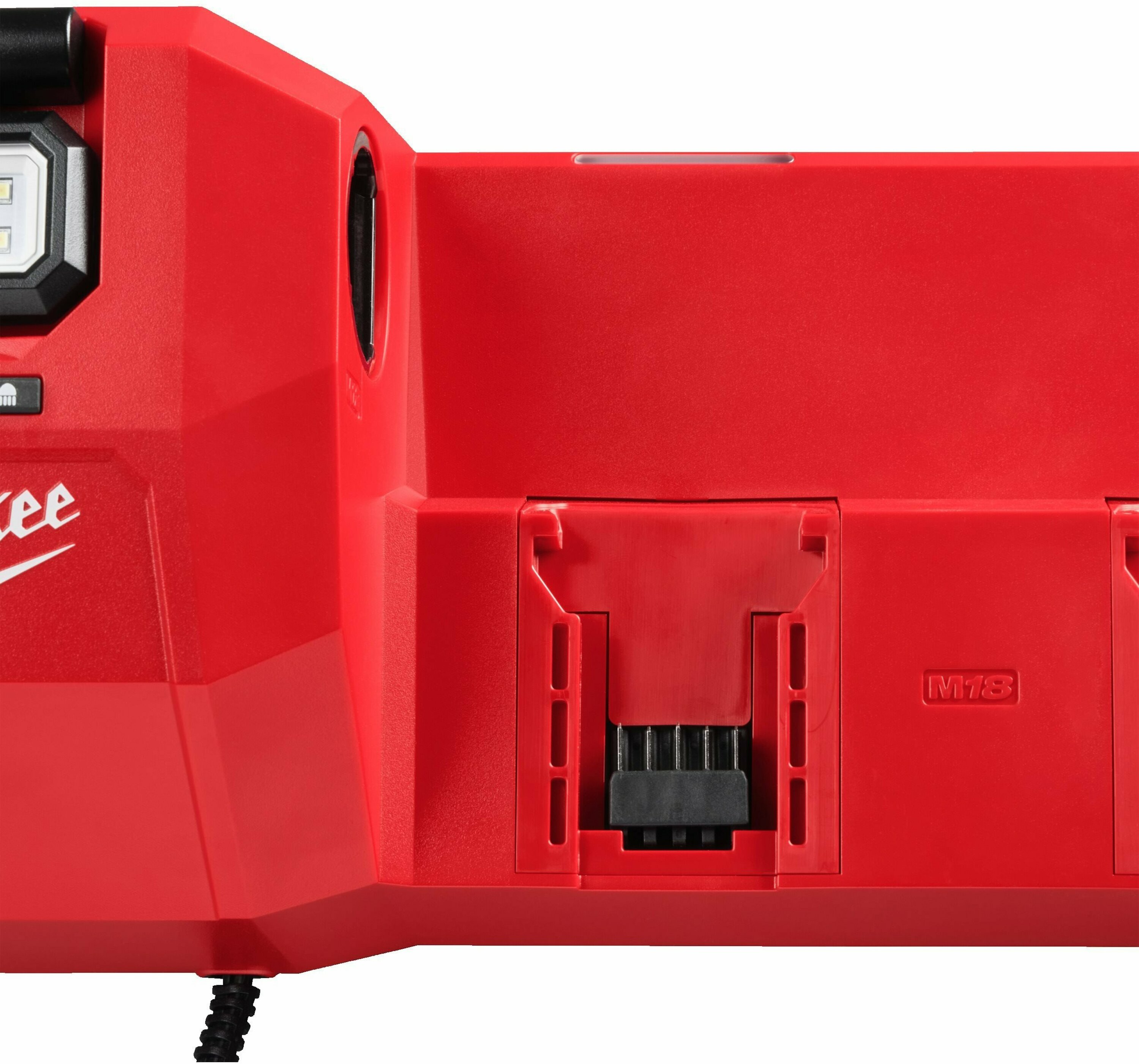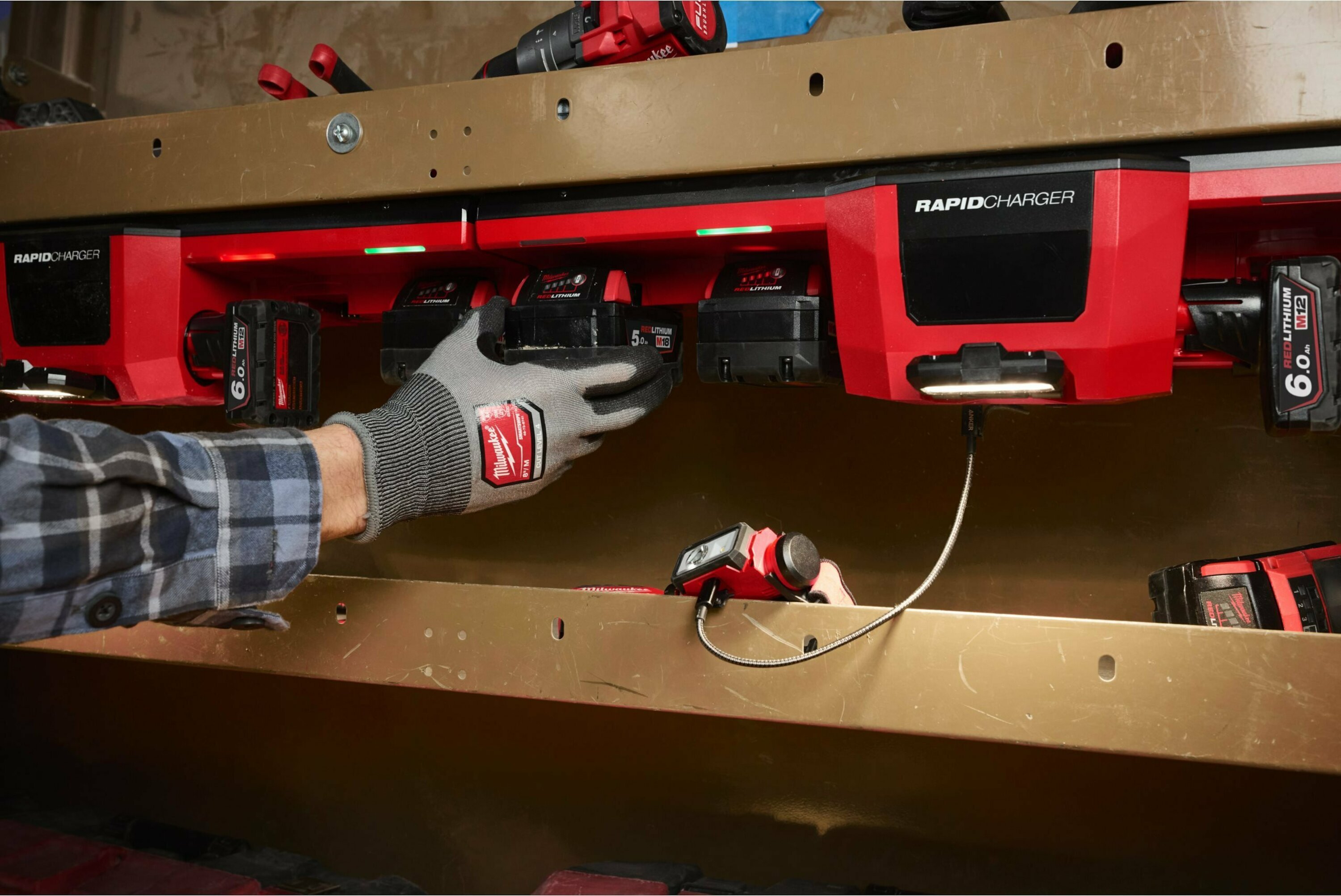 Magnetická nabíjecí stanice Milwaukee M12-18 GBC4 kombinuje rychlonabíječku a výkonné pracovní LED osvětlení v jednom kompaktním zařízení. Umožňuje současné nabíjení čtyř akumulátorů M12™ a M18™ a je ideální pro montáž do ocelových skříněk, kontejnerů či úložných prostorů na staveništi.