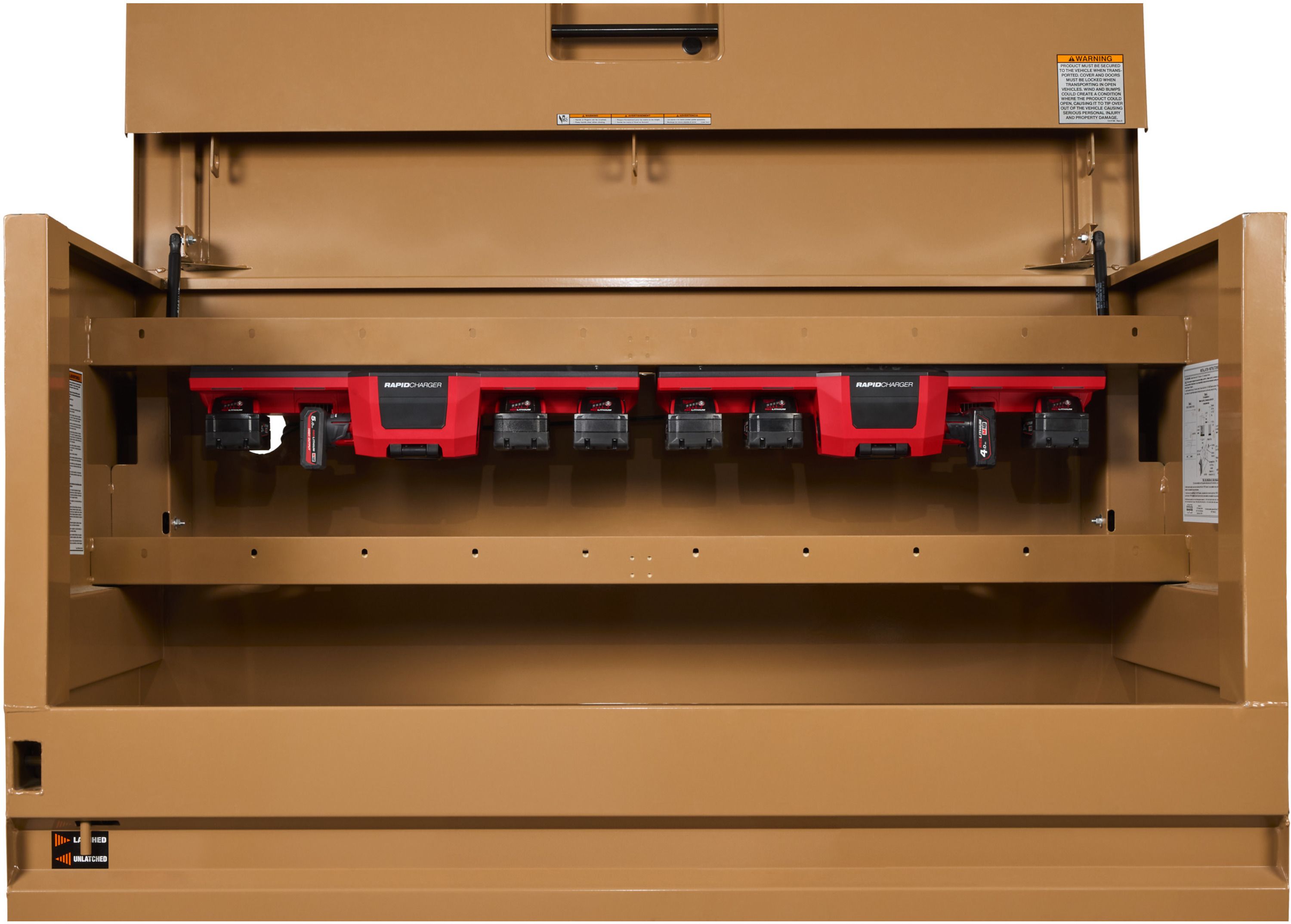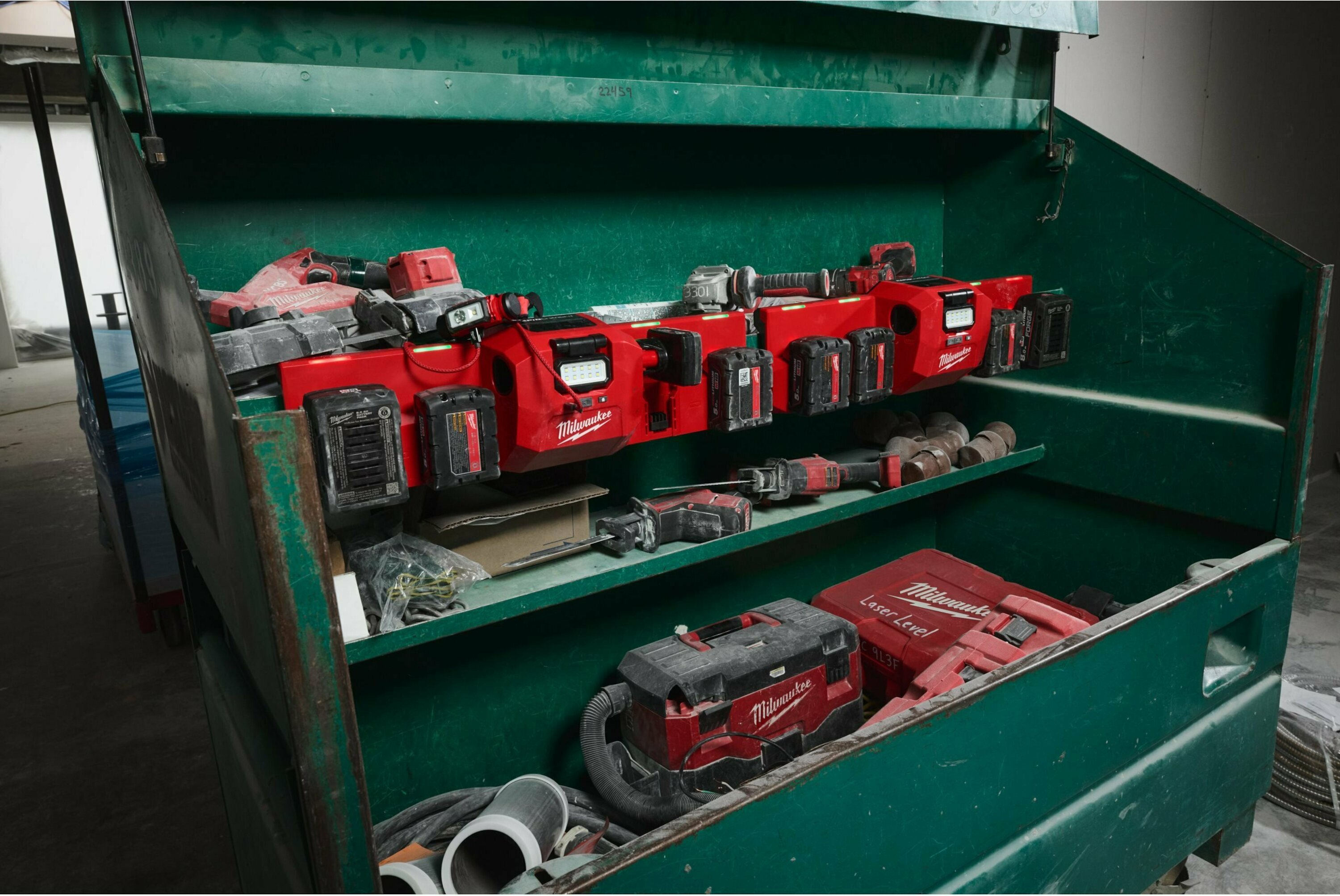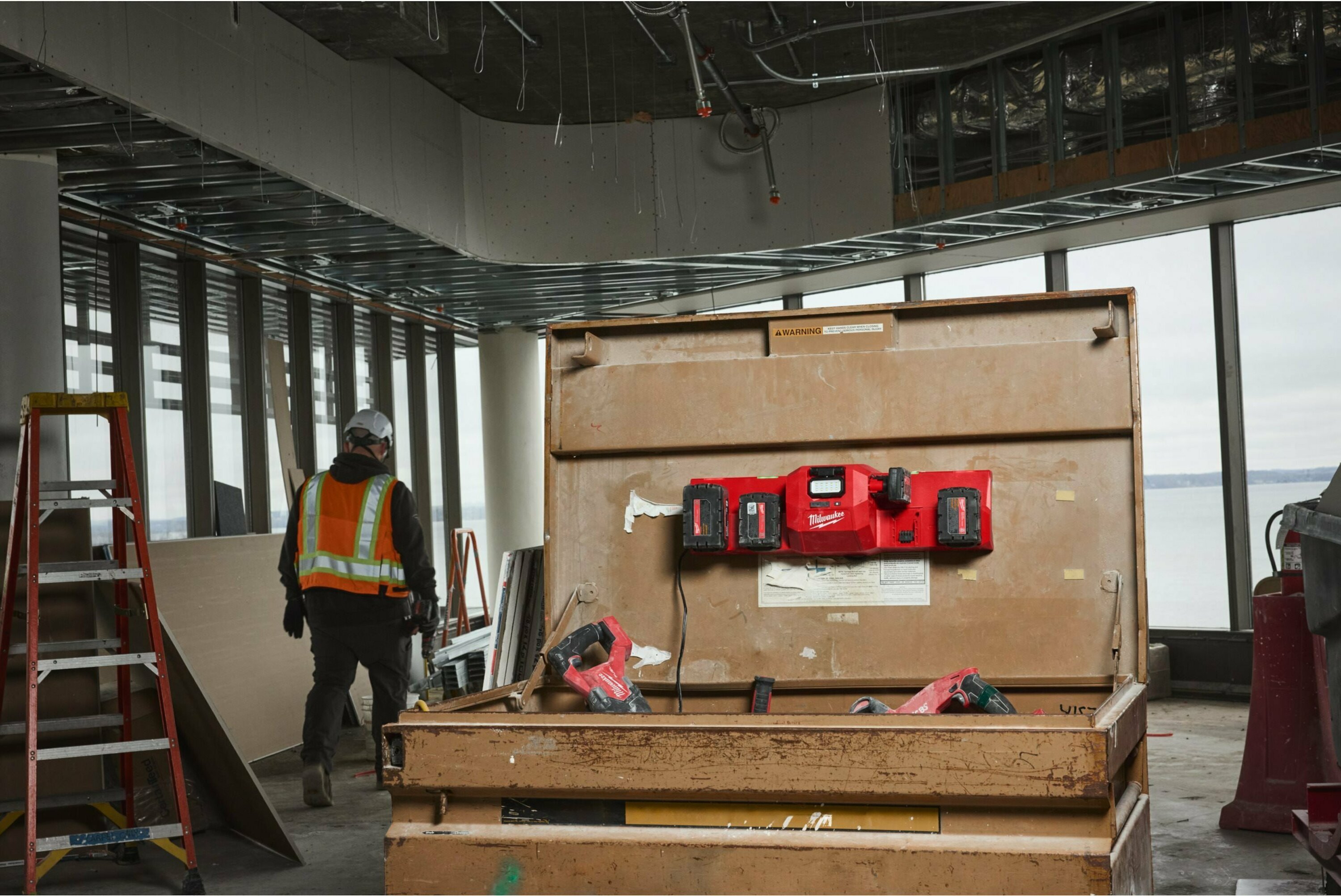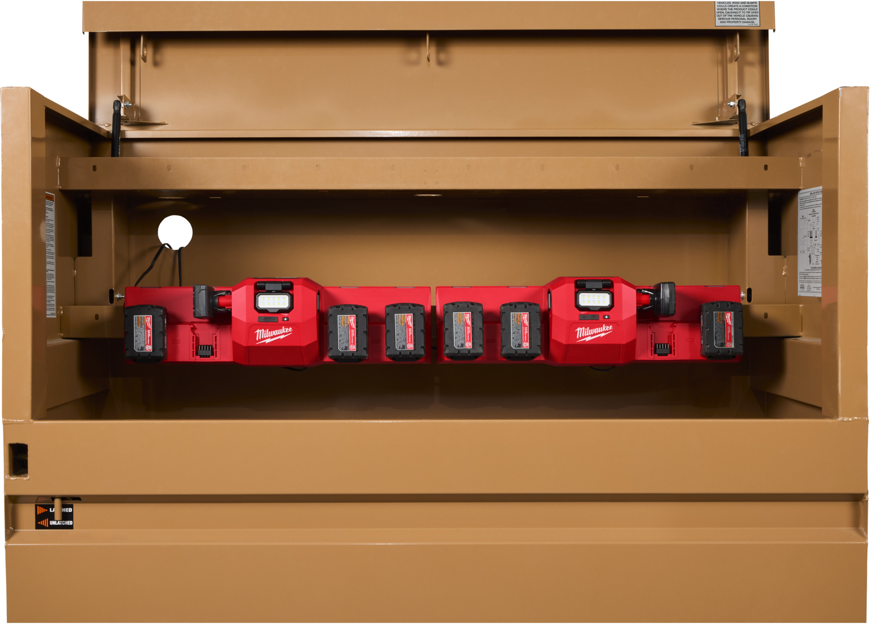 Magnetická nabíjecí stanice Milwaukee M12-18 GBC4 kombinuje rychlonabíječku a výkonné pracovní LED osvětlení v jednom kompaktním zařízení. Umožňuje současné nabíjení čtyř akumulátorů M12™ a M18™ a je ideální pro montáž do ocelových skříněk, kontejnerů či úložných prostorů na staveništi.