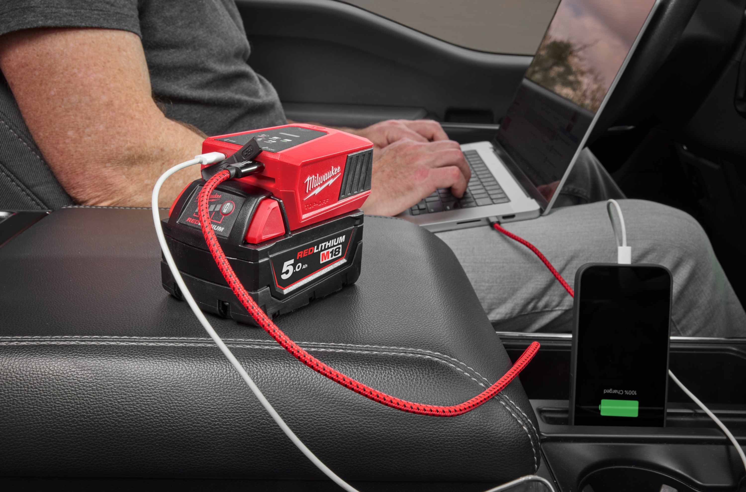 Kompaktní a výkonná nabíječka Milwaukee M18 TC-0 umožňuje nejen nabíjení akumulátorů M18™, ale zároveň slouží jako mobilní zdroj energie pro napájení elektroniky na stavbě, v dílně i na cestách. Díky malým rozměrům a nízké hmotnosti je ideální pro každodenní použití bez nutnosti nosit klasickou síťovou nabíječku. Tato kompaktní nabíječka je ideálním řešením pro profesionály, kteří potřebují mobilní zdroj energie přímo na pracovišti, v dílně nebo na cestách.