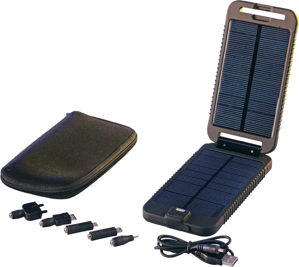 Li-Pol akumulátor o kapacitě 2500 mAh a dva polykrystalické fotovoltaické panely umožňují nabíjet většinu přenosných zařízení přes USB port