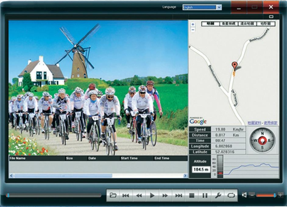 Uživatelsky příjemný videopřehrávač s ukazatelem rychlosti/polohy/výšky/času/trasy a kompasu