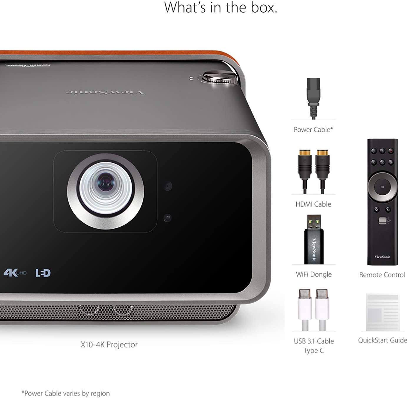 Kompaktní 4K projektor Viewsonic X10–4K (X10–4K) je perfektním náčiním pro domácí kino. Disponuje rozlišením Ultra HD (3840 × 2160), poměr stran 16:9, svítivost 2 400 LED lm, kontrast 3 000 000:1, velikost obrazu až 200 ", integrované 16GB úložiště, životnost LED až 30 000 hodin. Rozhraní: 2× HDMI, 2× USB-A, 1× USB-C 1× RJ-45, 1× optický audio výstup,, 1× , 2× 3,5 mm (vstup a výstup), čtečka karet SD. Stereo ozvučení Harman Kardon o výkonu 8 W.