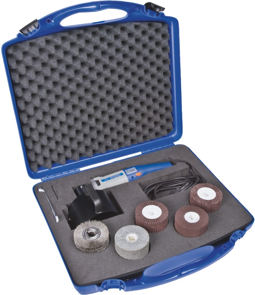 Vysoce výkonná elektrická bruska v sadě s Pferd nástroji pro čištění, matování, jemné broušení velkých ploch, především korozivzdorných ocelí (INOX)