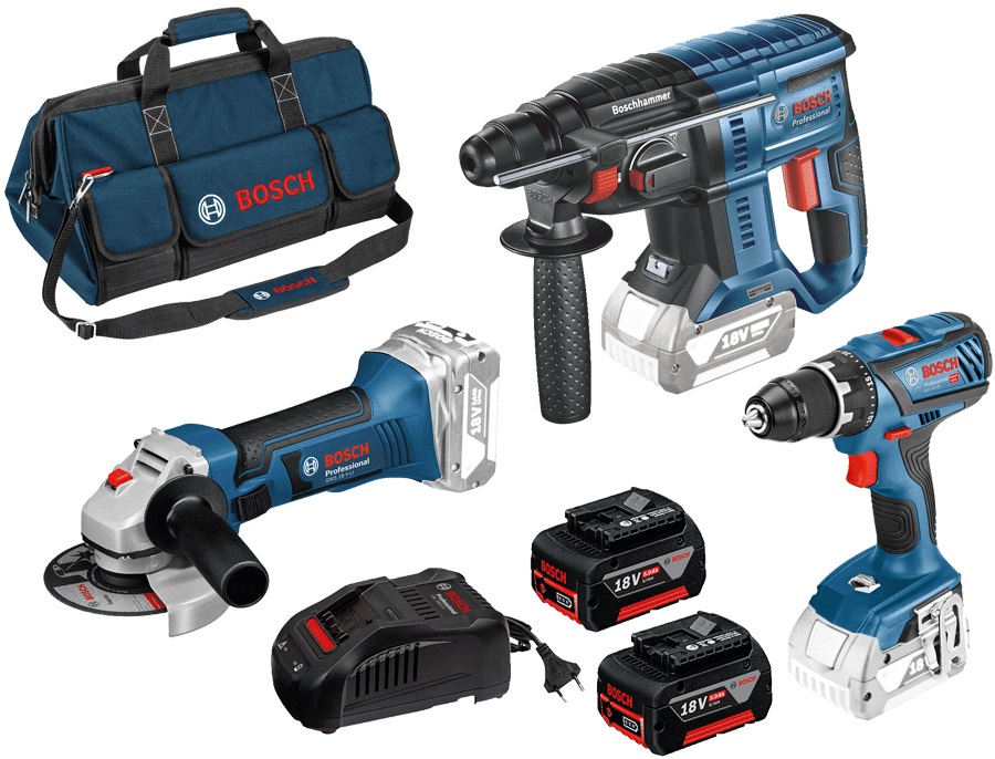 Bosch Professional 18V-Set: GSR + GBH + GWS + 2x GBA 5.0Ah, GAL, taška