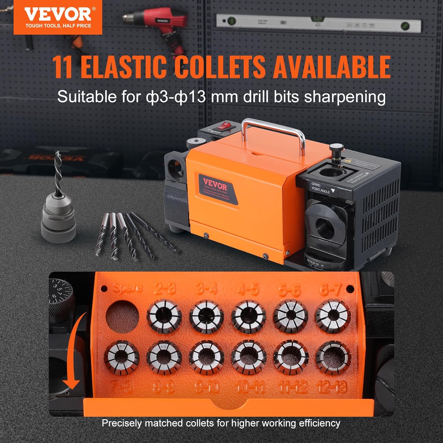 VEVOR bruska (ostřička) vrtáků 3-13 mm, 95°-135° nastavitelný úhel hrotu vrtáku + 11 kleštin + CBN & SDC kotouč