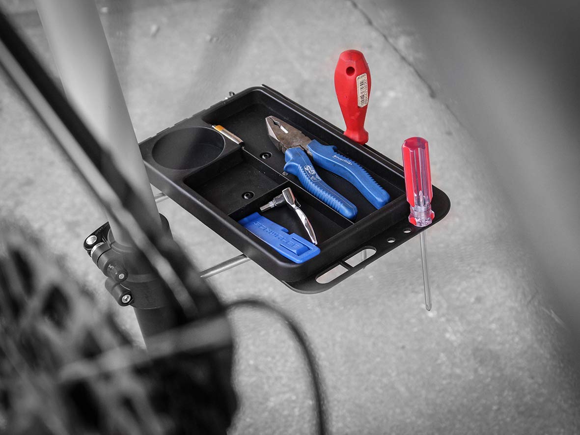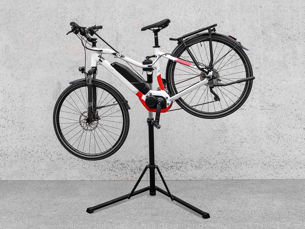 Praktický a vysoce kvalitní montážní stojan na kola s vysokou hmotností, např E-kola. Stojan umožňuje nastavit výšku a praktické uskladnění nástrojů umožňuje pohodlnou práci. Pokud se nepoužívá, může být složen, aby se ušetřil prostor.