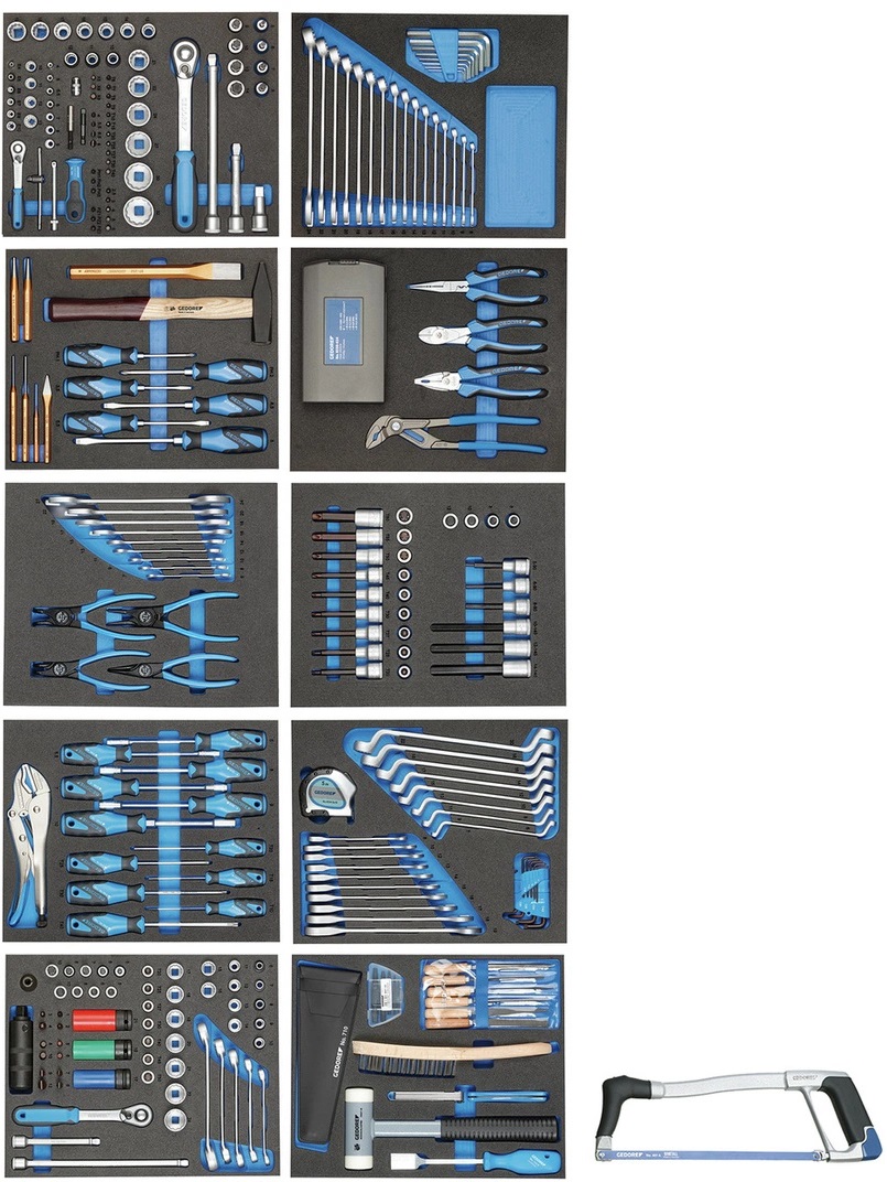 Dodává se plně vybavený 308dílnou sadou nářadí v metrických rozměrech uloženou v přesně tvarovaných dvoubarevných pěnových vložkách s kontrolním systémem GEDORE Check-Tool-System, který umožňuje rychlou vizuální kontrolu kompletnosti