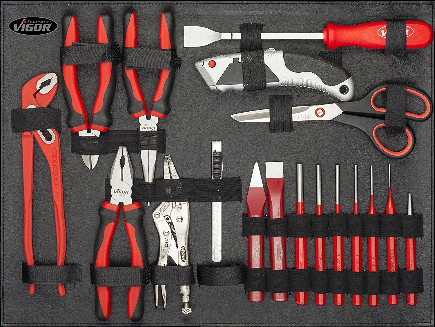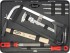 Sada obsahuje: Očkoploché klíče, Prodlužovací nástavce, Vyražeče, Hlavice s bity, Metr, Nůžky, Pinzetu, Torx, Golu, Kleště, Pilníky, Svítilnu, Dláto, Kardanový kloub, Nůž, Pilku, Šroubováky, Posuvné měřítko (šuplera), Imbus, Nástrčné klíče