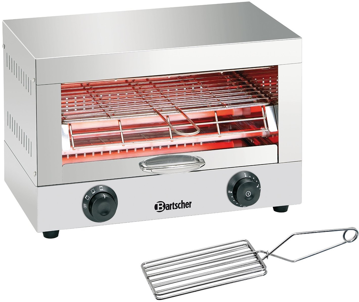 Toaster z nerezové potravinářské oceli, topný prvek z křemene, 15 minutové spínací hodiny, 1 grilovací rošt