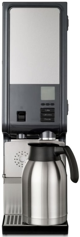 Výrobník horkých (instantních) nápojů s pevným připojením na vodu ¾ palce. Samostatný kohoutek na teplou vodu. S odkapávačem, automatickým programem na odstranění vodního kamene a čištění. S 1 zásobníkem. Výrobník je speciálně určen pro přípravu více nápojů, např ve džbánků (vydává také jednotlivé porce). Pro přípravu kávy nebo horké čokolády.
