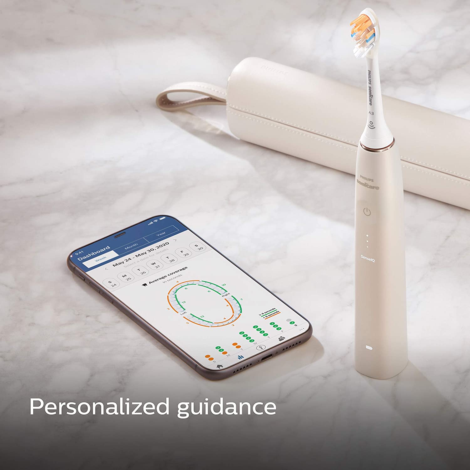 Při čištění snímá technologie SenseIQ tlak, pohyb, pokrytí vyčištěných míst a další parametry až 100x za sekundu. Poté upraví intenzitu, pokud na kartáček příliš tlačíte. Díky umělé inteligenci technologie SenseIQ nemusíte při čištění spoléhat na pouhý odhad správné techniky čištění, takže si v průběhu času můžete užít snadnou péči a lepší čištění zubů.