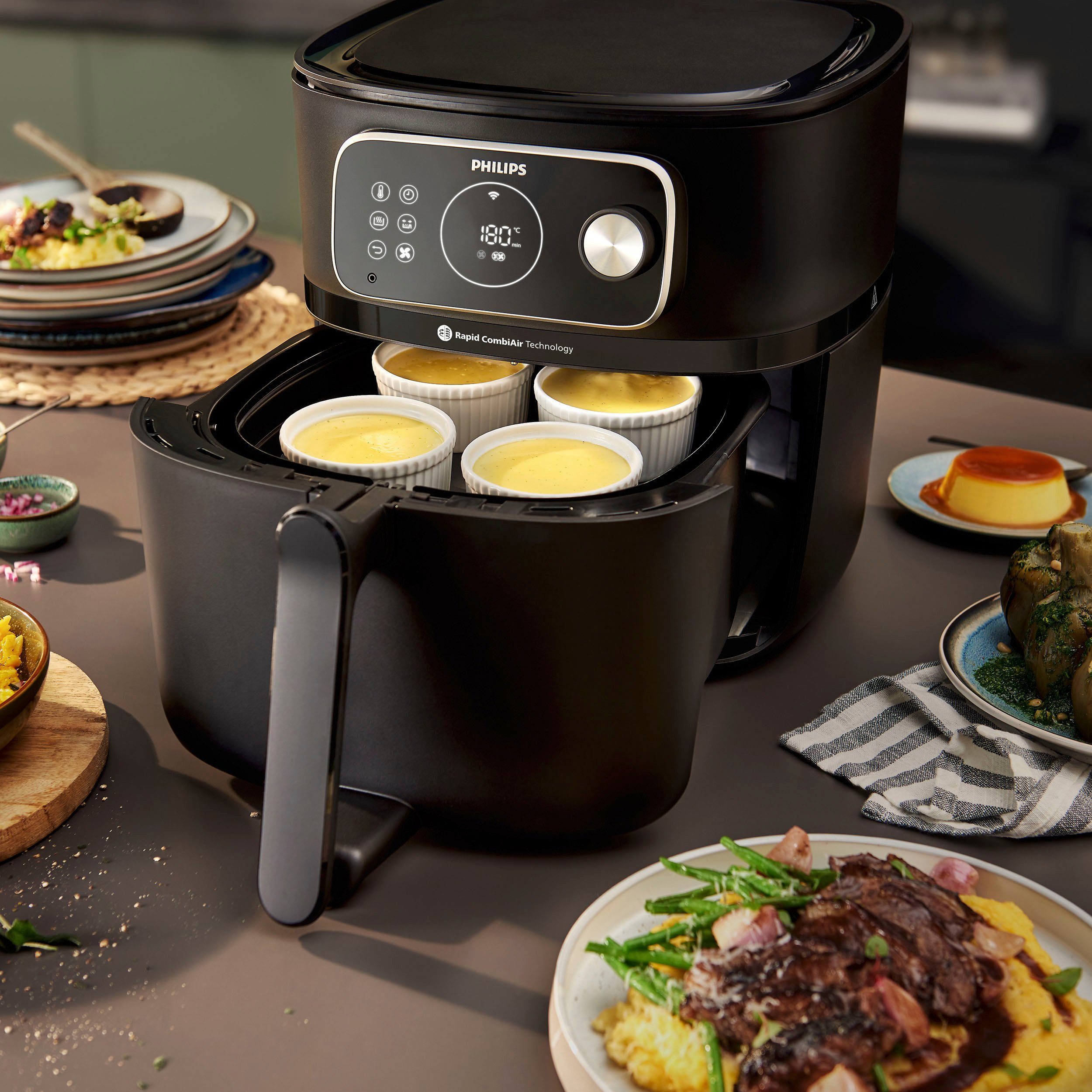 Philips HD9875/90 Airfryer Combi XXL je horkovzdušná fritéza s technologií Rapid CombiAir. Tato fritéza je vybavena teploměrem na potraviny a programy automatického vaření. Navíc je možné ji propojit se službou NutriU.