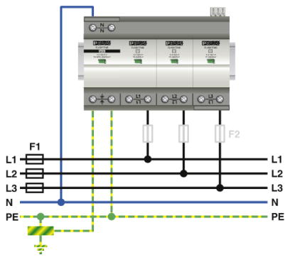 Zásuvný svodič blesku, podle typu 1 / třída I, pro 3fázové napájecí sítě s odděleným N a PE (L1, L2, L3, PE, N)