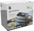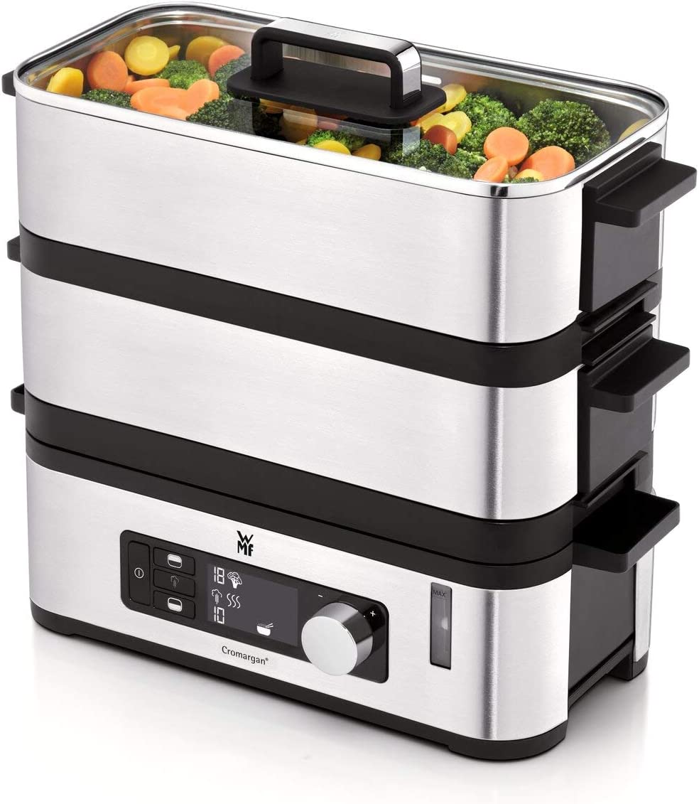 Kompaktní napařovač WMF KITCHENminis® je vyroben z nerezové oceli Cromargan®. Napařovač je díky svému provedení vhodný ke zdravému vaření, neobsahuje bisfenol A. Napařovač o velikosti jen 14,4 × 28,4 cm a výkonu 900 W umožňuje připravovat zároveň maso, ryby, zeleninu a přílohy až na dvou plochách. Dokonalé vaření vám zajistí technologie WMF Easy Steaming, dvě samostatné plochy k přípravě pokrmů, LCD obrazovka a intuitivně přednastavené programy. Potěší možnost udržení teploty až po dobu 40 min.