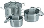 4-dílná sada nádobí na varné desky Vhodné pro všechny typy varné desky: plynová, elektrická, keramika, indukce, halogen 18/10 nerezové oceli Rendlík ø 16 cm, 1,5 l Rendlík ø 20 cm, 3 l Polévku ø 24 cm, 5 l Skleněné víko