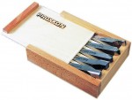 Pětidílná sada soustružnických nožů Z vysoce kvalitní HSS kobaltové oceli Již nabroušené Uběrák, upichovák, hladík, pravý a levý stranový nůž Dodávány v dřevěné krabičce s posuvným víkem 8 × 8 × 80 mm
