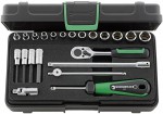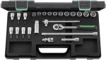V robustní ABS-skříňce z umělé hmoty 38-dílná Rozsah dodávky : 9 ks nástrčná hlavice se šestihranem č. 40: rozměr klíče 4; 5; 5,5; 6; 7; 8; 9; 10; 11 mm 10 ks nástrčná hlavice č. 52: rozměr klíče 13; 16; 17; 18; 19; 21; 22; 24; 27; 30 mm