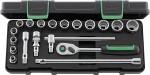 V robustní ABS-skříňce z umělé hmoty 19-dílná Hmotnost 1 kg Rozsah dodávky : 13 kusů nástrčná hlavice se šestihranným otvorem č. 40: rozměr klíče 3,5; 4; 4,5; 5; 5,5; 6; 7; 8; 9; 10; 11; 12; 13 mm 1 kus ráčna č. 415QR N 2 kusy