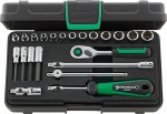 V robustním ABS-kufr z umělé hmoty 19-dílná sada Hmotnost 1,9 kg Rozsah dodávky : 14 ks nástrčných hlavic s dvojitým šestihranem č. 45: rozměr klíče 8; 9;10; 11; 12; 13; 14; 15; 16; 17; 18; 19 ; 21; 22 mm 1 ks ráčna č. 435QR N 2 ks