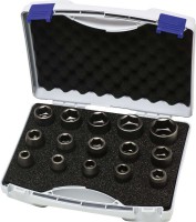15 nástrčkových klíčů, šestihranných, z tepelného výkovku o velikostech: 10, 11, 12, 13, 14, 15, 16, 17, 18, 19, 21, 22, 24, 27, 30 mm