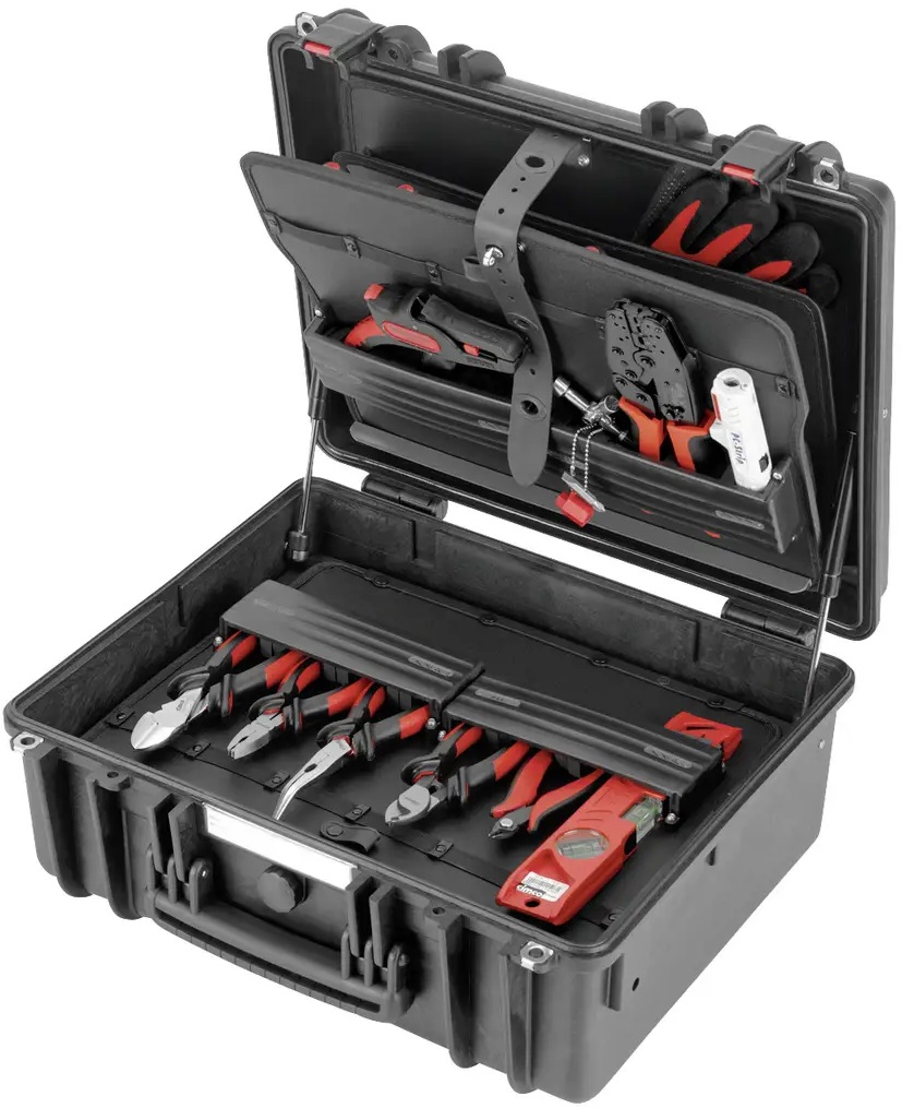 Profesionální elektrikářský kufr Cimco GIGANT 176841 je určen pro každodenní práci montážních a servisních techniků. Nabízí 22 kusů vysoce kvalitního izolovaného nářadí 1000 V v odolném kufru z tvrdého plastu. Obsahuje kompletní sadu nástrojů pro elektroinstalace – od lisovacích kleští a odizolovacích nástrojů až po šroubováky Slim a kabelové nůžky DUOCUT.