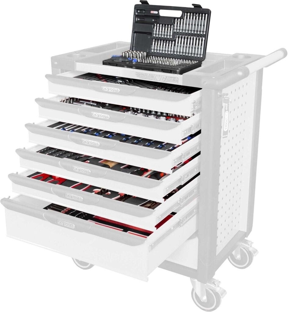 Kompletní profesionální sada nářadí v systémových pěnových vložkách určená pro vybavení dílenských vozíků.