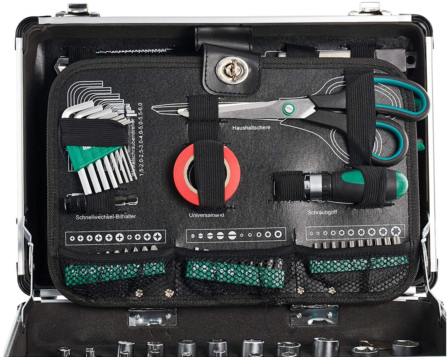 Přihrádka 3: domácí nůžky; 8 inbusových klíčů s vnitřním šestihranem, CV ocel, SW 1,5 - 6,0 mm; 1 role lepící pásky; přepínací ráčna; rychloupínací držák bitů; 30 bitů 25 mm, CV ocel: 5x plochý, 5x bit s vnitřním šestihranem, 6x křížový, 4x Pozidriv, 10x profil bit