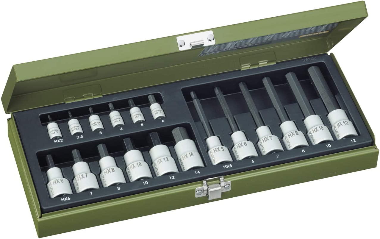 Kompletní 18-dílná sada obsahuje zástrčné hlavice Inbus délky 33mm pro 1/4" uchycení HX 2 -2,5 - 3 -4 - 5 - 6mm (6ks) zástrčné hlavice Inbus délky 55mm pro 1/2" uchycení HX6 - 7 - 8 - 10 - 12 - 14mm (6ks) a zástrčné hlavice Inbus délky 100mm pro 1/2" uchycení HX5 - 6 - 7 - 8 - 10 - 12mm (6ks). Hlavice 1/4" (6,3mm) jsou určeny pro utahovací momenty do 25 Nm hlavice 1/2" (12,5 mm) pro utahovací momenty 25 – 210 Nm.