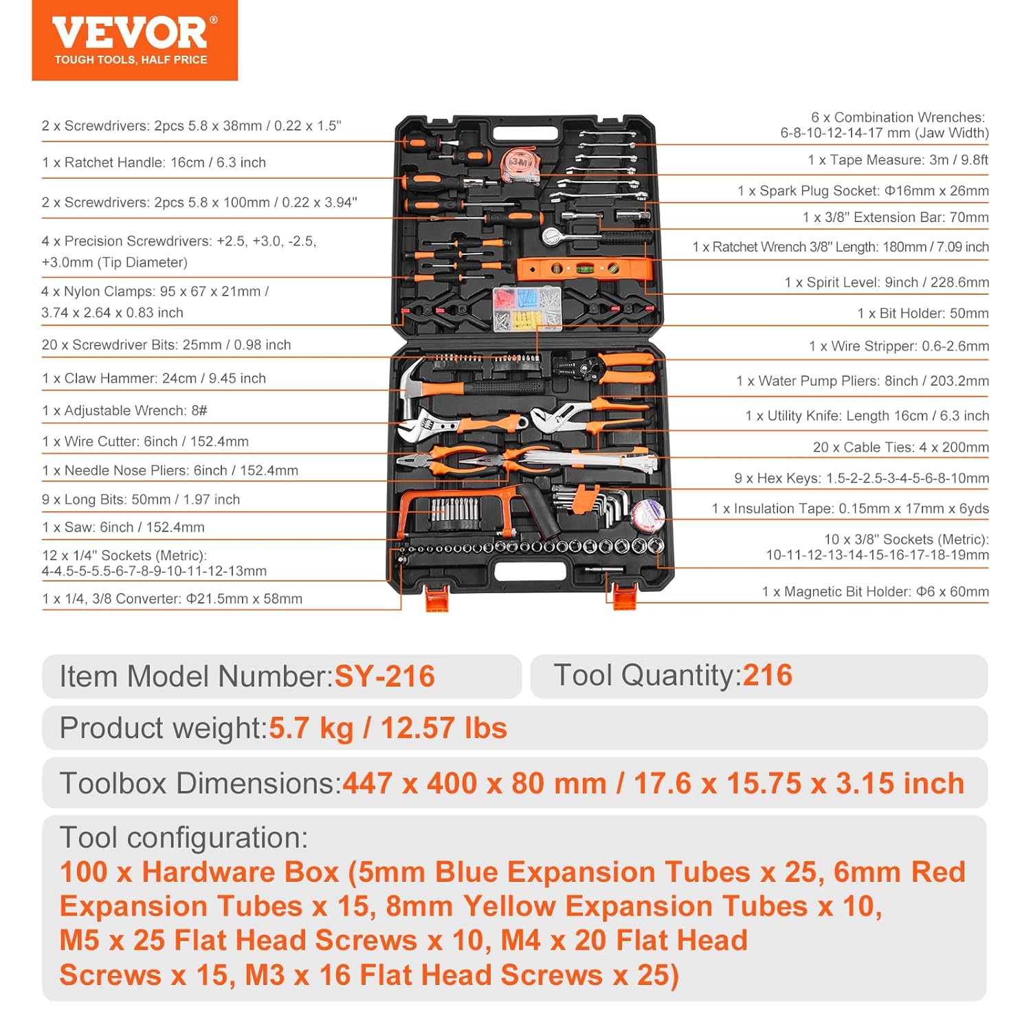 VEVOR 216-dílná univerzální sada nářadí představuje kompletní řešení pro běžné domácí opravy, údržbu v dílně, montáže i práce na automobilu