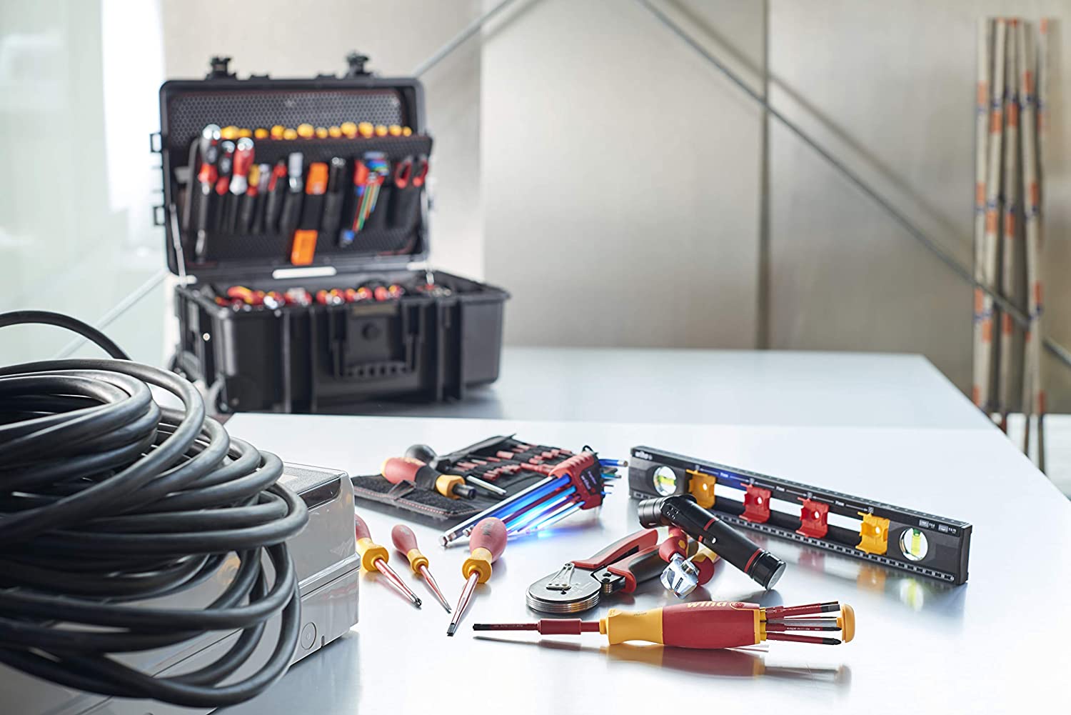 Konvenční kufry na nářadí často nejsou dostatečně robustní, mají málo úložného prostoru a nástroje jsou obtížně přístupné. Tyto nedostatky byly jednou a navždy odstraněny během vývoje 115dílného případu elektrikáře Competence XXL II od společnosti Wiha. Vložky nástrojů jsou v tomto případě navrženy s ohledem na efektivní práci, aby bylo možné všechny nástroje rychle a snadno vyjmout. Díky rozsáhlému vybavení mají elektrikáři pro každé použití připravené správné nářadí, jako je například držák bitů elektrického zásobníku LiftUp, sada momentových šroubováků, plně izolované šroubováky z rodiny Wiha Slim nebo instalační kleště TriCut. Velký úložný prostor kufru na nářadí obsahuje také vodováhu speciálně navrženou pro elektrikáře. Pouzdro, které je vyrobeno z robustního polypropylenového plastu, je také vybaveno tlumiči tlaku plynu, které drží víko v různých polohách a zabraňují jeho automatickému uzavření a zabránění zranění.
