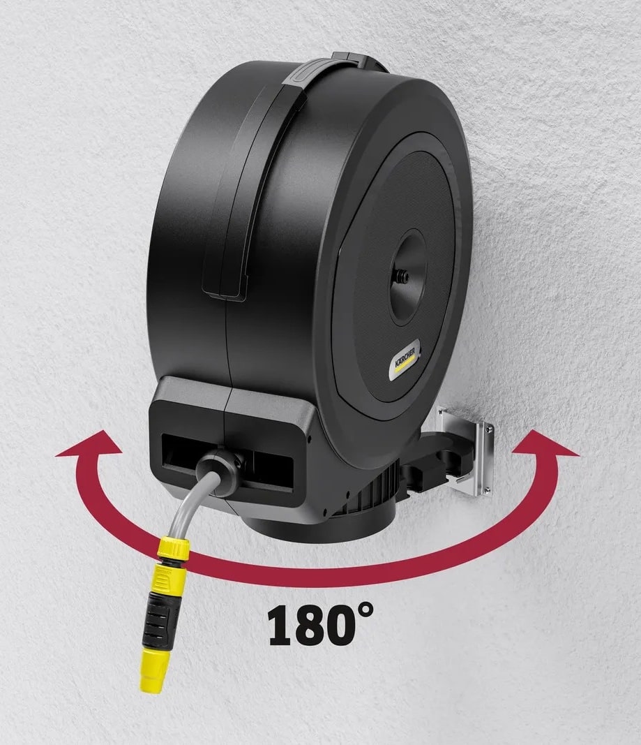 Na nástěnném držáku lze hadicovou skříňku otáčet o více než 180°, to umožňuje maximální volnost pohybu při zalévání zahrady, aniž by se hadice zalomila