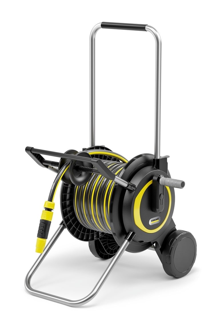Stabilní a robustní vozík na hadici umožňuje prostorově úsporné skladování zahradní hadice a je velmi pohodlný při používání. Hadici lze spolehlivě navinout pomocí ergonomické kliky a robustního vedení hadice. Vozík na hadici boduje také extra širokou základnou pro maximální stabilitu a odolností proti UV záření a mrazu. Díky inovativním rychloupínacím pákám lze teleskopickou rukojeť pohodlně nastavit do správné výšky nebo ji lze posunout zcela dolů. Především její posunutí zcela dolů zajišťuje prostorově úsporné skladování. Vozík je připraven k okamžitému použití díky dodávané 20m hadici a příslušenství, jako jsou spojky Kärcher, adaptér na kohoutek a tryska. Vozík na hadici se dodává kompletně smontovaný. Vozíky na hadice Kärcher se vyznačují robustností a dlouhou životností a výrobce na ně poskytuje pětiletou záruku.