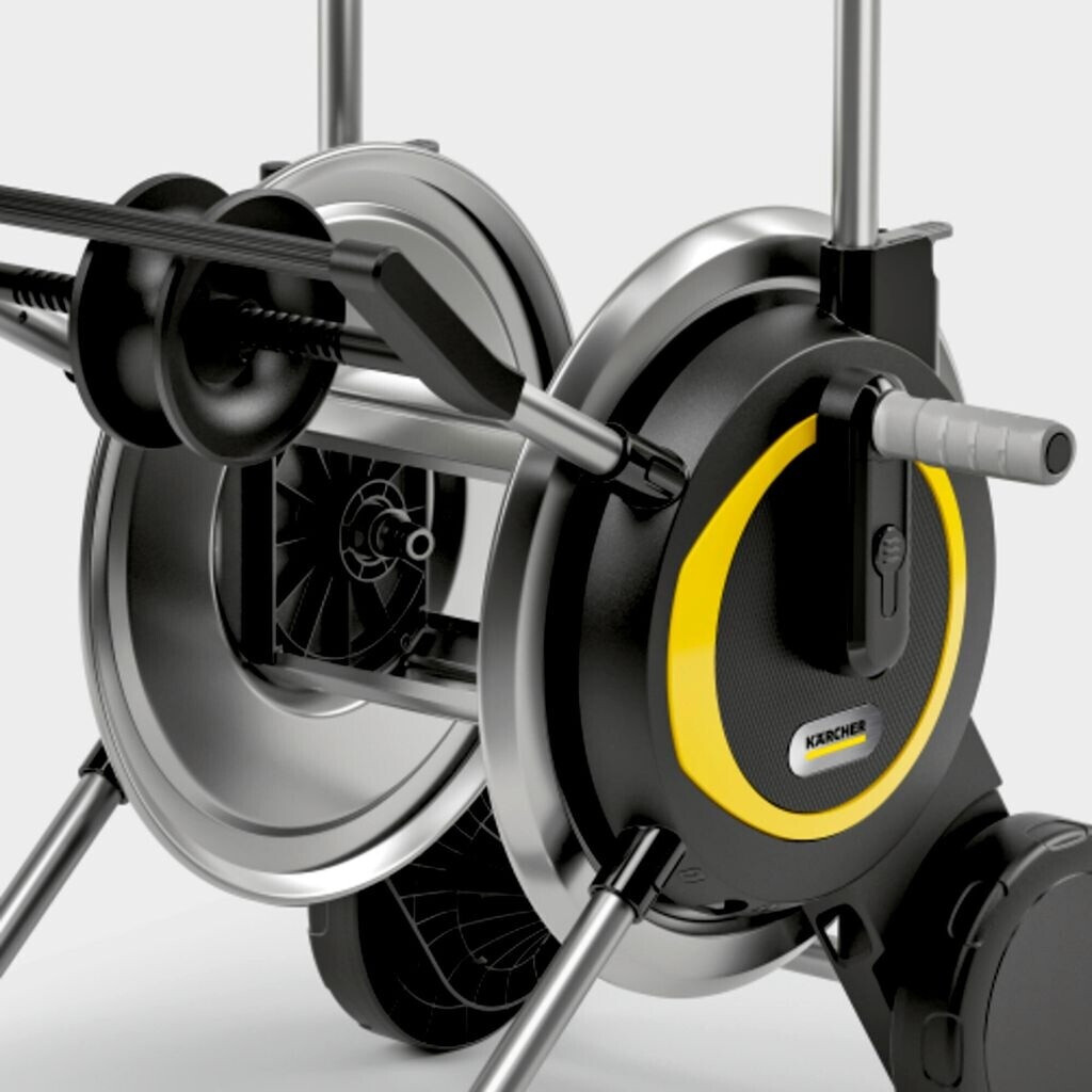 Robustní a zároveň stabilní, vozík na hadici umožňuje prostorově úsporné uložení zahradní hadice a je velmi pohodlný při používání. Díky robustnímu kovovému navijáku nepředstavuje problém ani nejtěžší náklad. Hadici lze spolehlivě navinout pomocí ergonomické kliky a robustního vedení hadice. Vozík na hadici boduje také extra širokou základnou pro maximální stabilitu a odolností proti UV záření a mrazu. Díky inovativním rychloupínacím pákám lze teleskopickou rukojeť pohodlně nastavit do správné výšky nebo ji lze posunout až dolů. Zatlačení úplně dolů zajišťuje především prostorově úsporné skladování. Vozík na hadici se dodává kompletně smontovaný. Skladovací vozíky na hadice Kärcher se vyznačují robustností a dlouhou životností a výrobce na ně poskytuje pětiletou záruku.