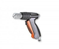 Rozprašovací pistole s protiskluzovým ergonomickým držadlem, plynulou regulací rozstřiku, jednoduše ovladatelnou vpředu umístěnou aretací, regulací přítoku vody, se skvělým designem a funkční zdatností, s chromovými komponemty