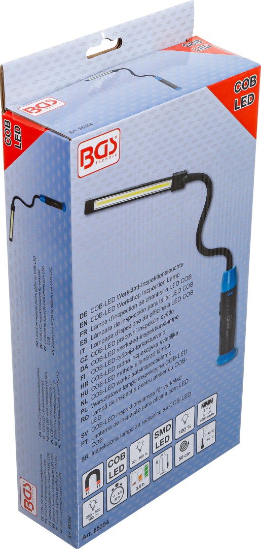 Pracovní světlo BGS 85354 s technologií COB a SMD LED nabízí silné osvětlení a maximální flexibilitu při práci. Díky ohebnému husímu krku lze světelnou hlavici snadno nastavit do požadovaného úhlu. Vestavěné magnety umožňují připevnění na kovové povrchy, ideální pro servisní a dílenské nasazení.