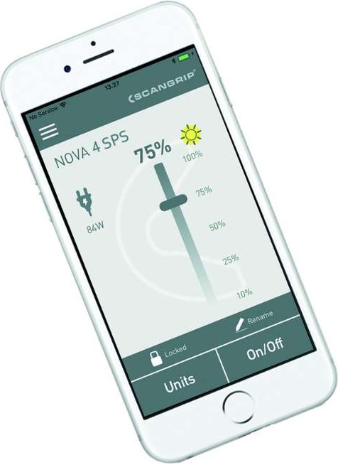 SCANGRIP NOVA 6 SPS - pracovní světlo s možností ovládání pomocí bluetooth a napájeno pomocí SCANGRIP nabíjecí baterie (SPS) Lampa SCANGRIP NOVA 6 SPS je vybavena nejnovější technologií COB LED a poskytuje světelný tok až 6 000 lumenů, což z ní činí univerzální všestranné pracovní světlo pro náročné profesionální uživatele