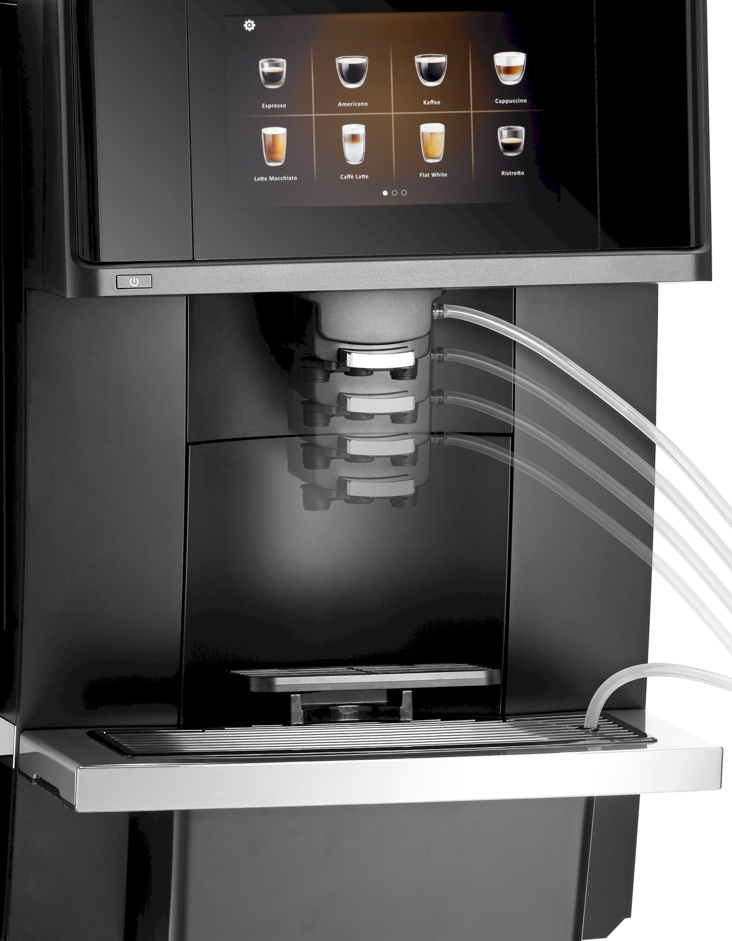 Kávovar pro 80 šálků denně, výkon max. 40 šálků á 120 ml / hod. Výškově nastavitelný výtok 110 - 165 mm. Objem zásobníku na zrna 1000g, obsah odpadní nádoby (vhodná do myčky) cca 35 šálků. Pevné připojení na vodu (pevná přípojka vody 1/2), 6 litrová odnímatelná nádoba na vodu nebo přívod vody přes externí nádobu. 7 palcový digitální ukazatel s 23 volitelnými programy, informací o údržbě, chybové hlášení, čisticí program. Uložení až 10 videí, USB připojení.