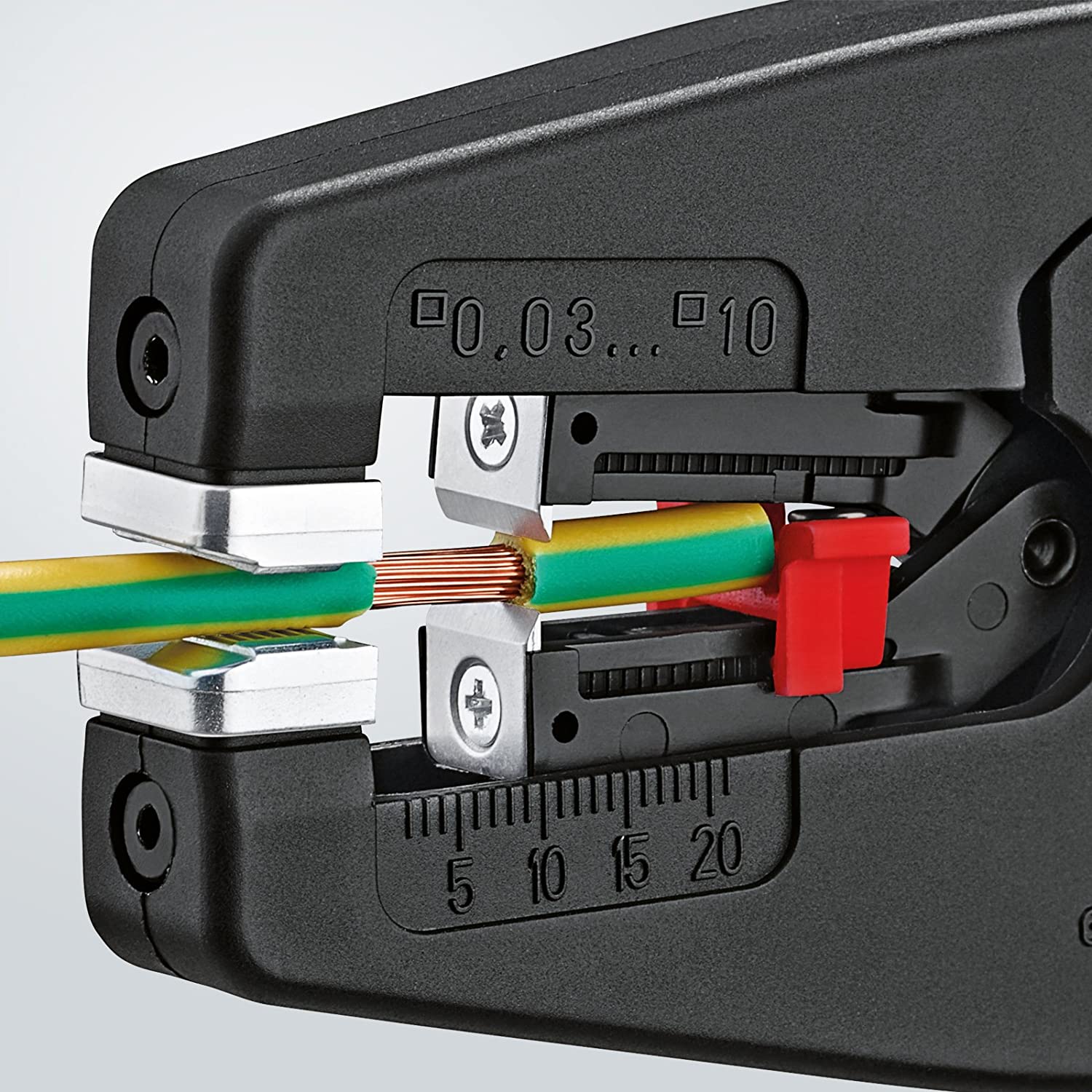 Plně automatické přizpůsobení všem běžným jednovodičovým i vícevodičovým kabelům se standardní izolací v celém kapacitním rozsahu 0,03 až 10,0 mm2. Není nutné jemné ruční nastavování, bez poškození vodičů. Upínací čelisti z oceli s integrovanou řeznou hranou přidrží kabel bezpečně tak, aby nesklouzl, aniž by se poškodila zbývající izolace. Pro řezání kabelů z Cu a Al, vícevodičových do 10,00 mm2 a jednovodičových do 6,00 mm2. Mimořádně lehký chod mechanismu a velmi nízká hmotnost. Výměnný nožový blok a délkový doraz. Rukojeť se zónou z měkkého plastu pro bezpečné uchopení. Těleso: plast, vyztužen optickými vlákny. Nůž: speciální nástrojová ocel, kalená v oleji