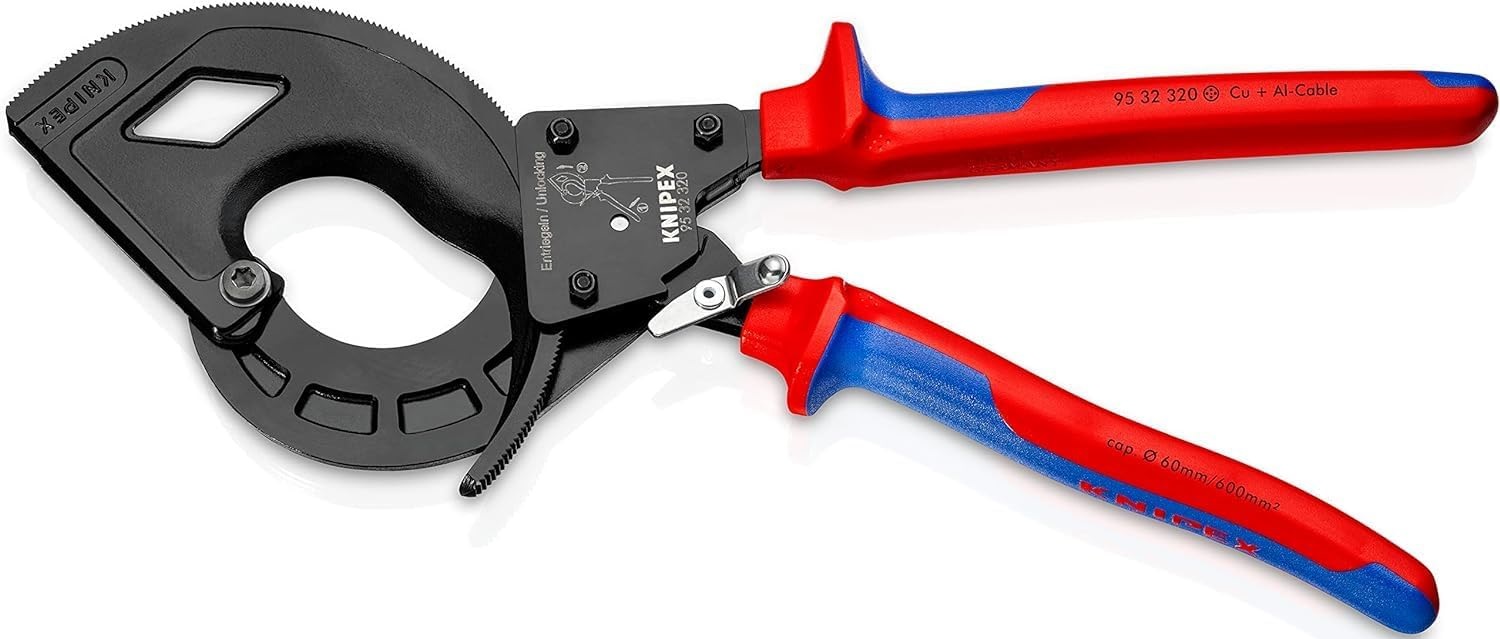 Profesionální ráčnové kleště Knipex 95 32 320 jsou určeny pro snadné a přesné stříhání měděných a hliníkových kabelů až do průměru 60 mm. Díky třírychlostnímu ráčnovému mechanismu s vysokým převodem umožňují efektivní práci v jednoručním i dvouručním režimu, a to i ve stísněných prostorech. Kompaktní konstrukce a nízká hmotnost přispívají k pohodlné manipulaci a dlouhé životnosti nástroje.