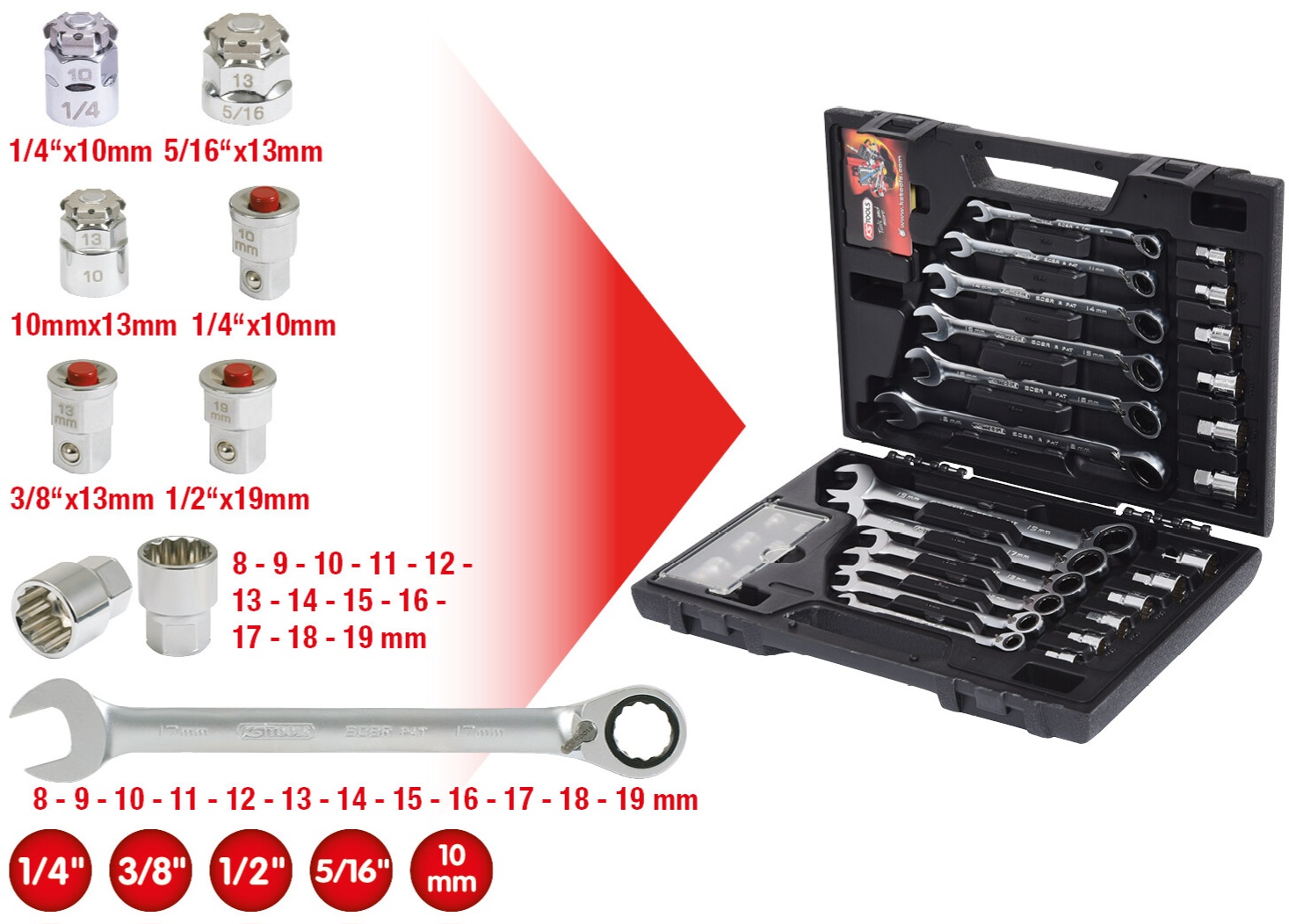 Profesionální 30-dílná sada ráčnových očkoplochých klíčů KS Tools GEARplus RINGSTOP je určena pro náročné použití v dílně i průmyslu