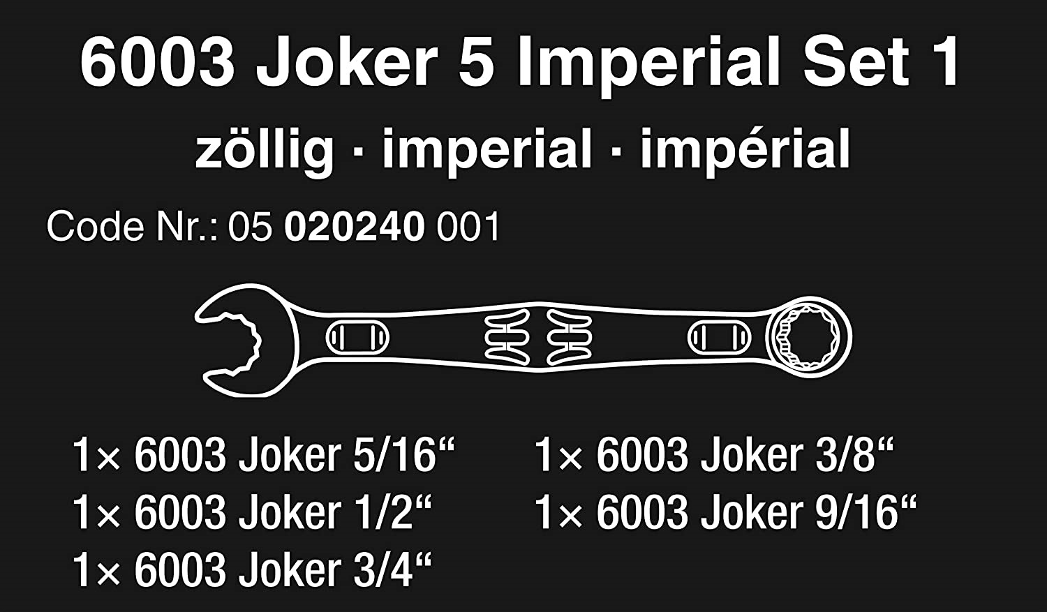 1x 6003 Joker 5 Imperial sada 1 sada plochých a očkových klíčů, coulové, 5 ks; 5x 6003 Joker očkoploché klíče a zollig: 5/16"x115, 3/8"x125, 1/2'x160, 9/16"x167, 3/4"x230