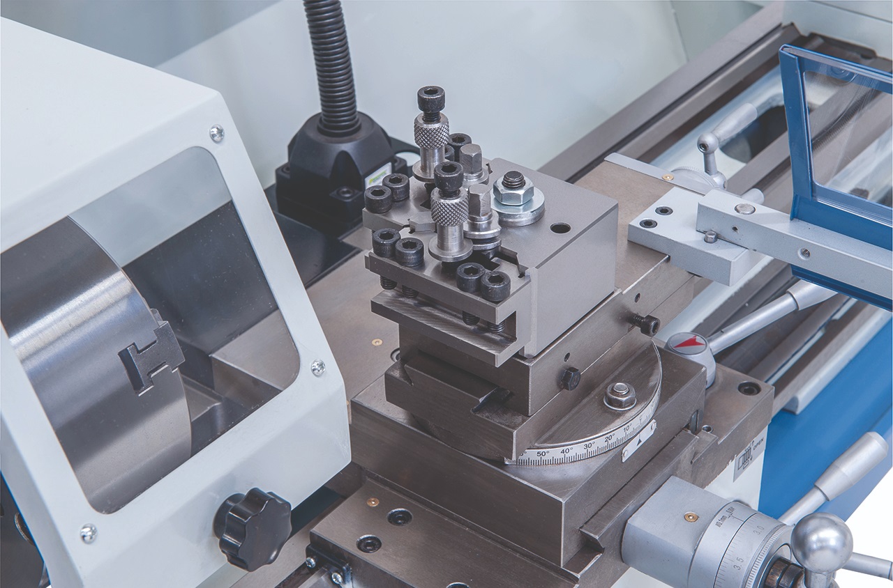 Stroj je standardně vybaven vodicím šroubem pro řezání závitů a automatickým podélným i příčným posuvem