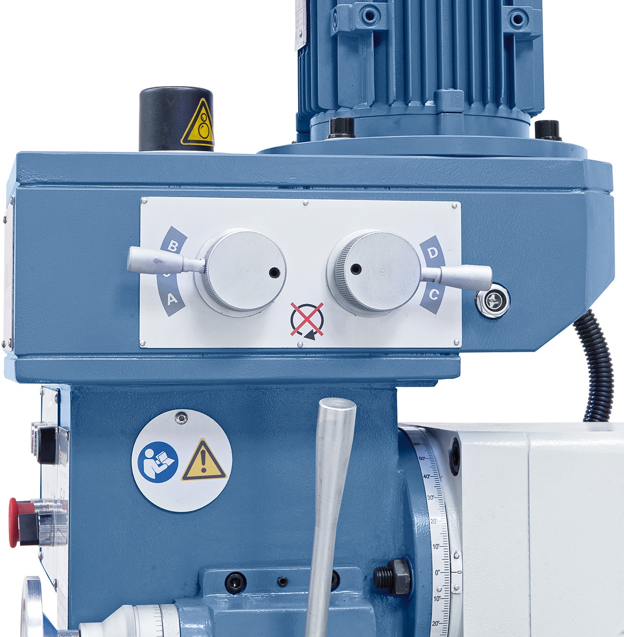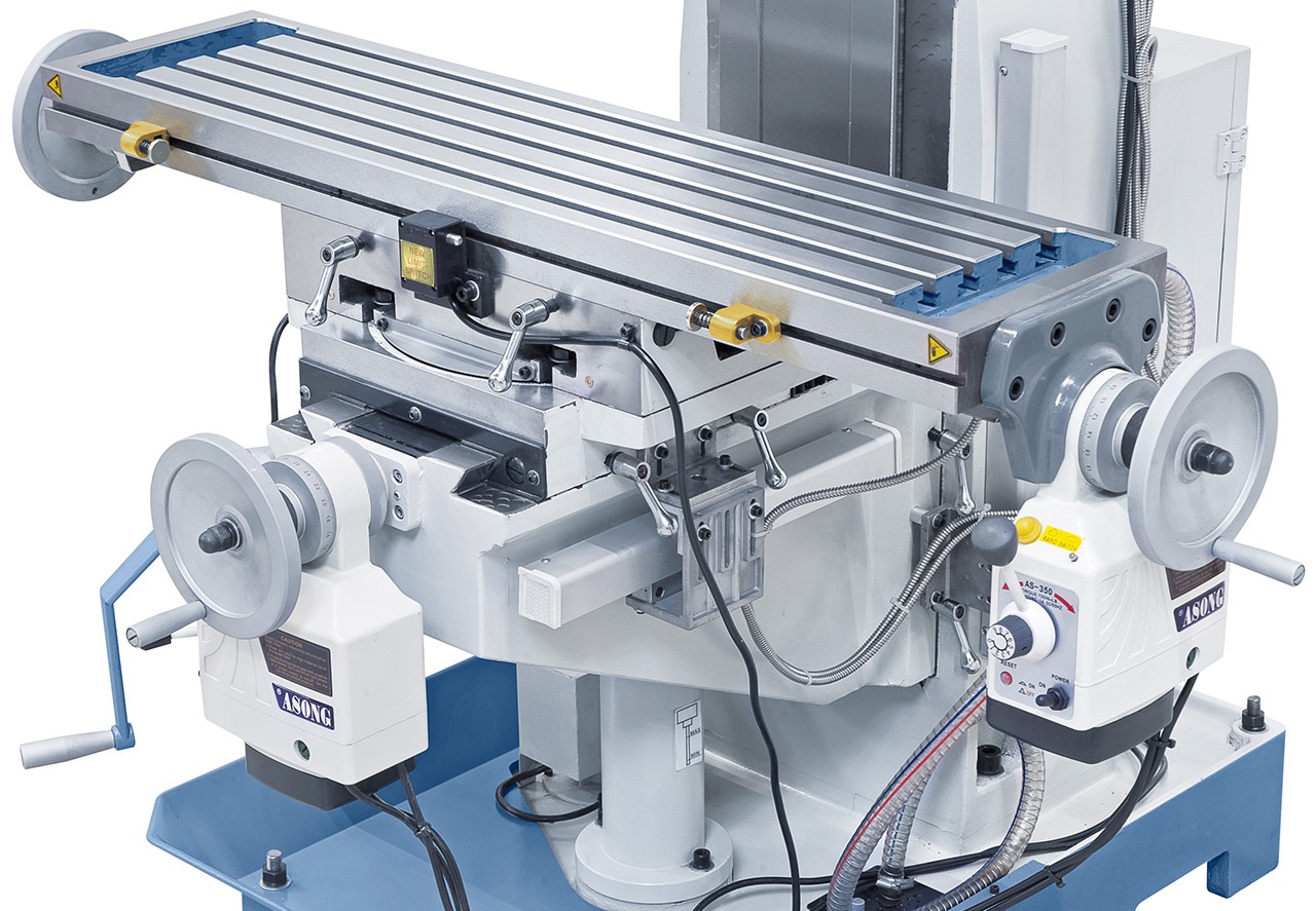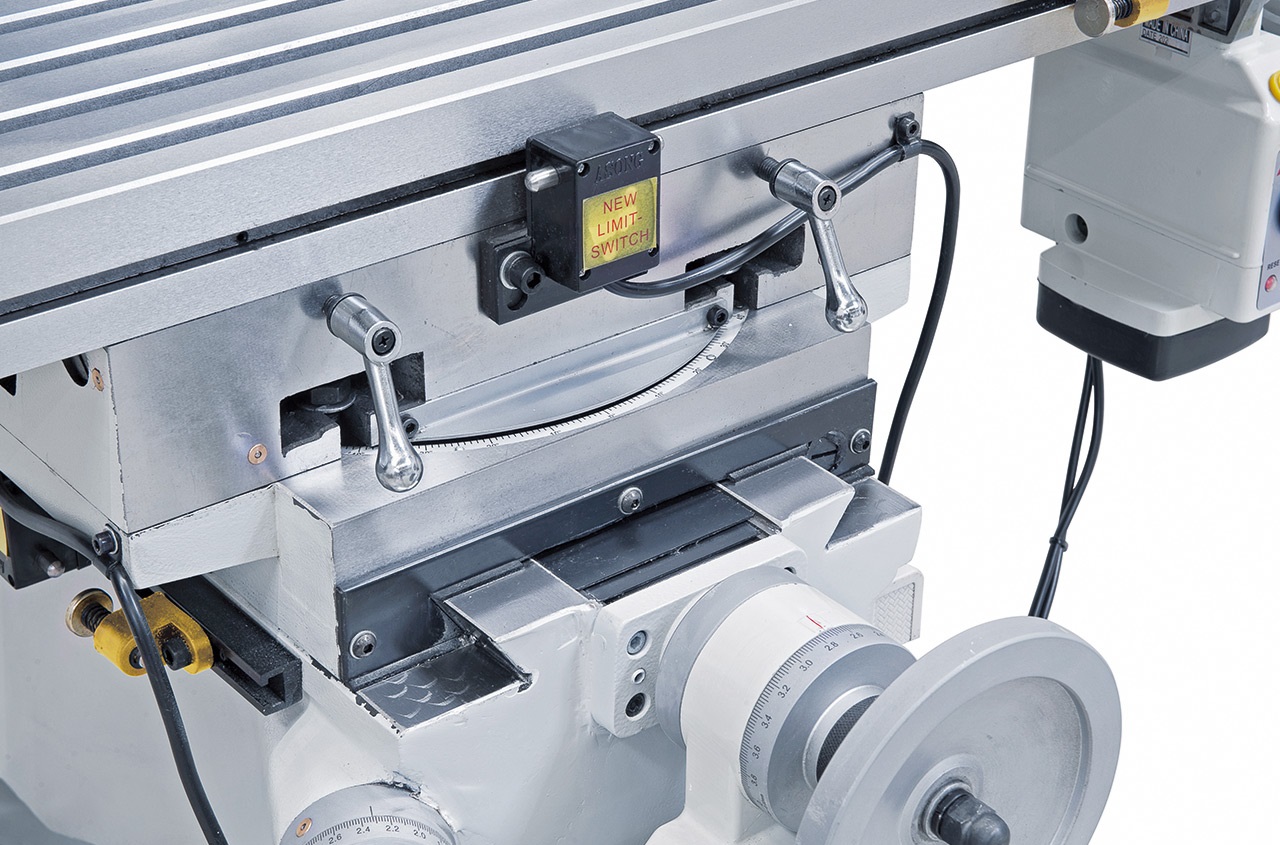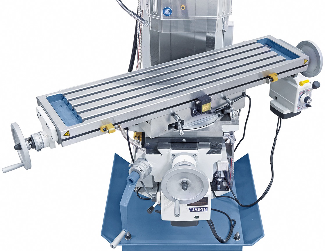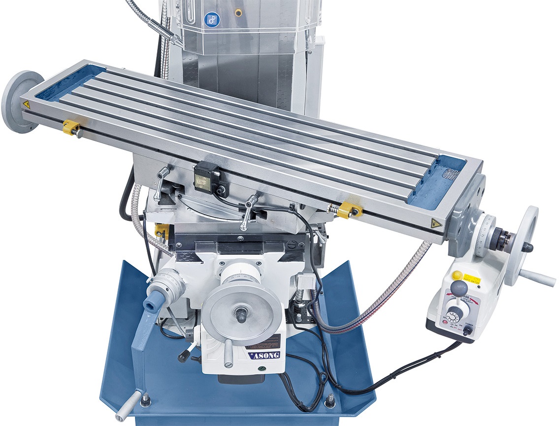 Výškově nastavitelný frézovací stůl a přísuv pinoly ručním kolečkem nebo vratidlem.