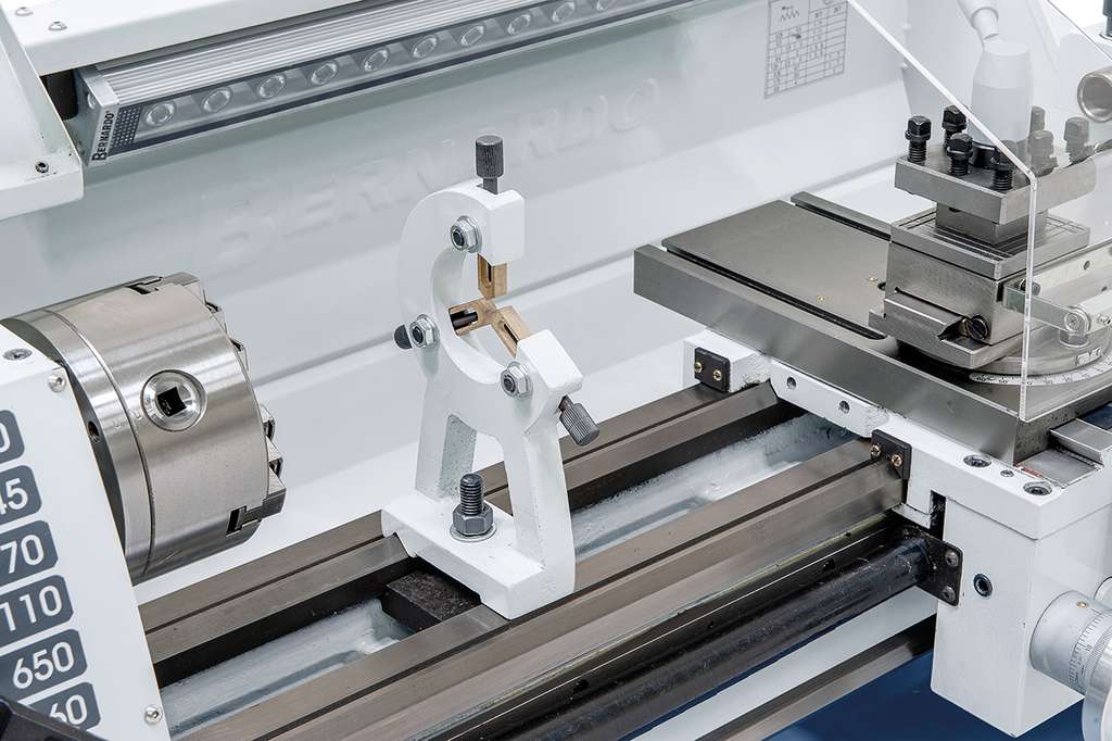 Stolní soustruh Bernardo Profi 650 G (400 V) je standardně vybaven vodicím a tažným vřetenem pro řezání závitů nebo pro automatické podélné a čelní posuvy