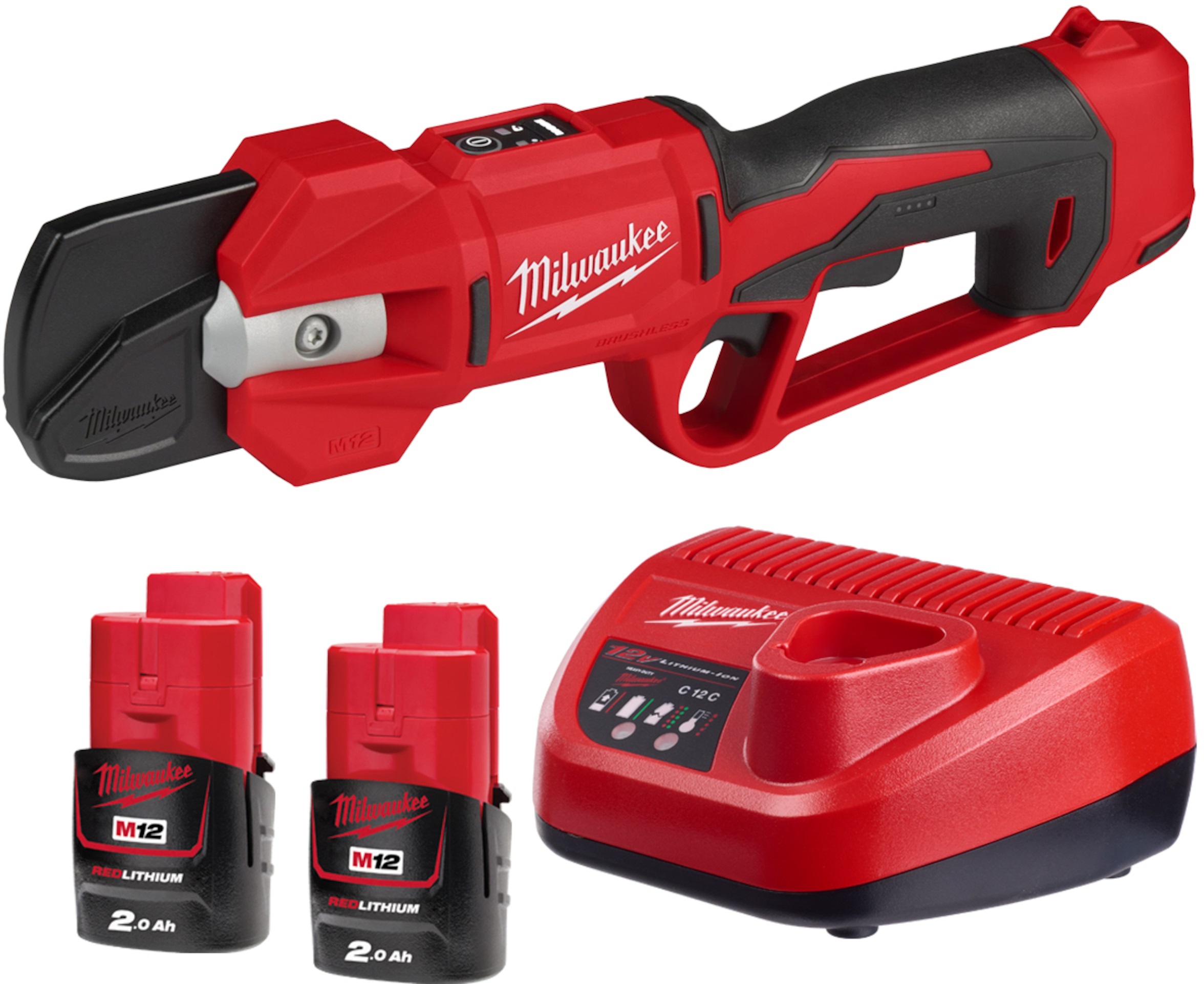 Milwaukee M12 BLPRS-202 aku vyvětvovací nůžky, střih do 32 mm, 2× 2,0 Ah, nabíječka, 4933480115
