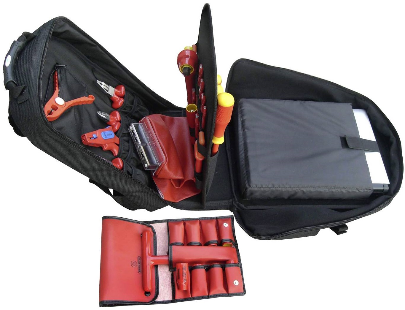 Batoh z vysoce odolného nylonu s polstrovaným nosným systémem s popruhem přes bricho a hrud a pogumovaným ergonomickým držadlem. Zvnějšku má batoh vždy na levé a pravé straně vysazeni kapsu a stejně tak vysazeni velkou přední kapsu se zipem, vložku pro adresu a kapsu na mobil. Batoh lze uzavřít kvalitním zipem, který se dá otevřít o 90 st. Uvnitr batohu na zadní straně je 8 přihrádek pro nářadí. Na vyjímatelné nářaďové desce je Umístění na přední straně 8 přihrádek a na zadní straně 2 řady elastických úchytu pro další nástroje. Uvnitr na přední straně je polstrovaná příčka pro notebook. V základním vybavení je batoh vybaven 36 nástroji VDE. Bezpečnostní nářadí BERNSTEIN jsou podle nařízení VDE EN 60.900 izolované, jednotlivé kontrolované a nabízejí záruku pro maximální bezpečnost. Dvoubarevná vícevrstvá izolace umožní ihned videt Poškození vnější cervené izolace pomocí žluté izolace, která je pod ní. Předností je snadná a Kdykoli proveditelná bezpečnostní kontrola.